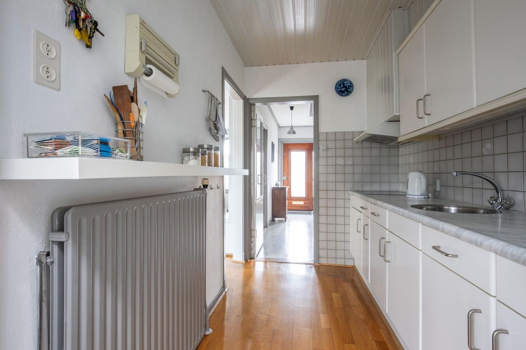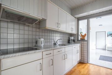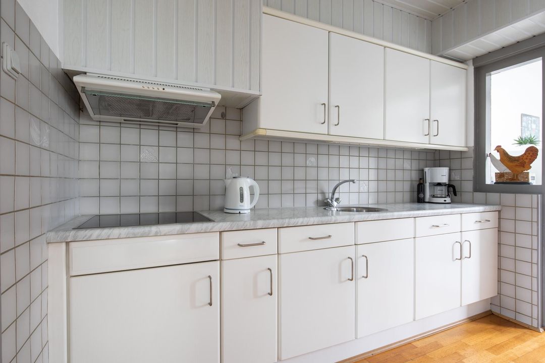 De keuken: De eenvoudige keuken is uitgerust met een keramische kookplaat, een vlakscherm afzuigkap en een spoelbak. De keuken geeft toegang tot de bijkeuken in de aanbouw. Hier bevinden zich de aansluitingen voor de wasmachine en de droger. Er is een vaste kastenwand aanwezig; fijn die extra opbergruimte.