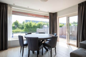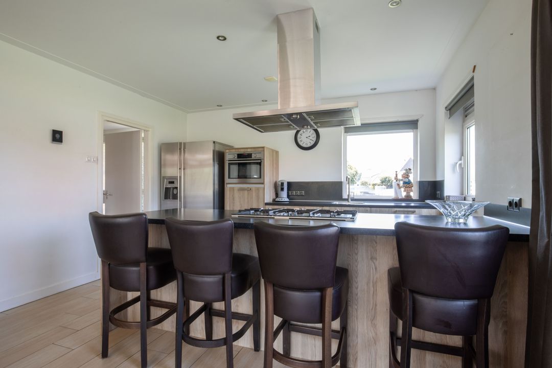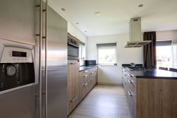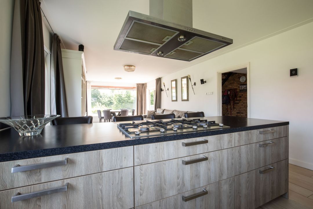 De woonkamer is gelegen aan de achterzijde van de woning en heeft dankzij de grote raampartijen een fijne natuurlijke lichtinval. De woonkamer staat in verbinding met de sfeervolle open keuken met schiereiland. De keuken is voorzien van, een 6-pits gasfornuis, een vaatwasser, een combi-oven en