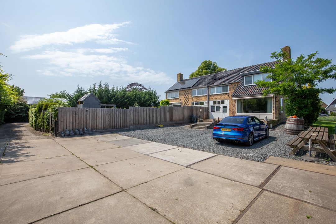 Entree van de woning is bereikbaar via de groene voortuin. Aan de achterzijde is er volop ruimte om meerdere auto’s op eigen terrein te parkeren en de mogelijkheid om de woning te betreden. Via een zijweg langs de buren rijd je middels een recht van overpad zo achterom.