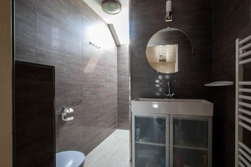 De badkamer is uitgerust met inloopdouche, toilet en wastafelmeubel. De badkamer heeft een natuurlijke lichtinval dankzij het dakraam.