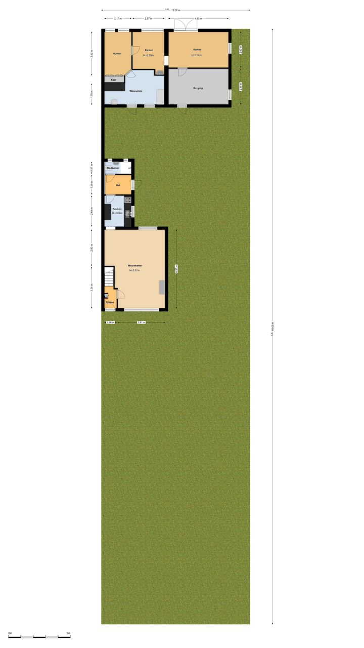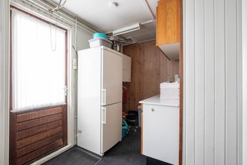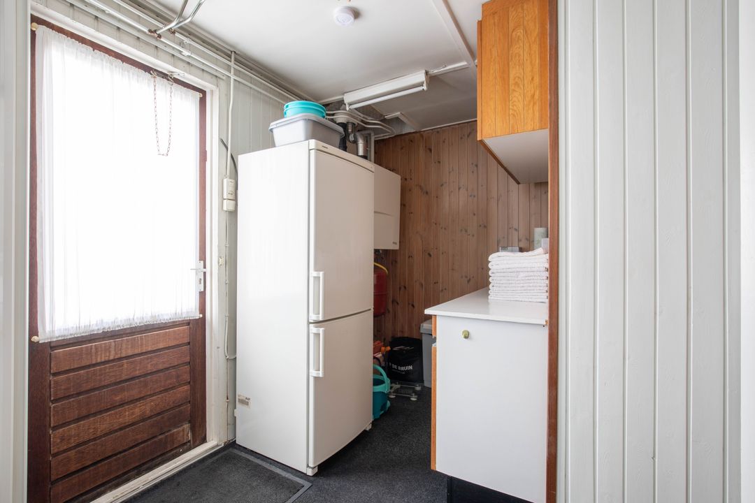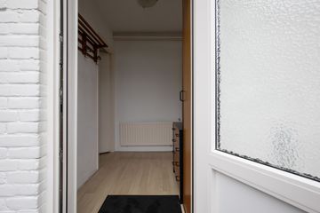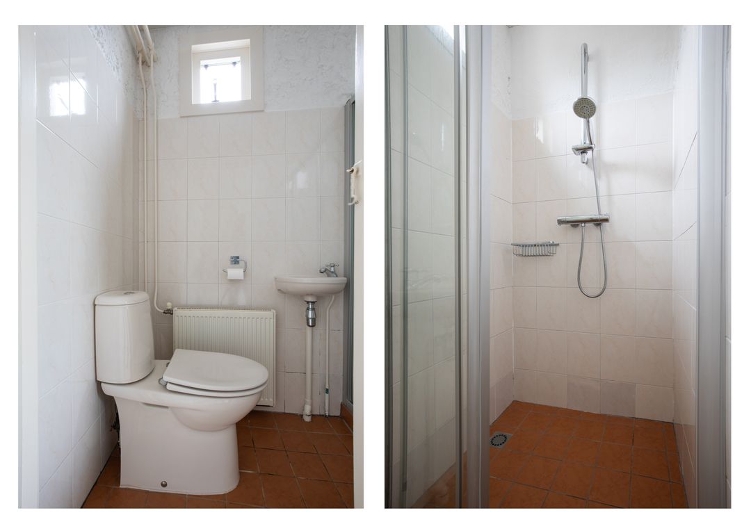 De keuken leidt naar de hal aan de zijkant van de woning die tevens als entree kan worden gebruikt. Via deze hal betreedt u de badkamer voorzien van een douche en toilet.