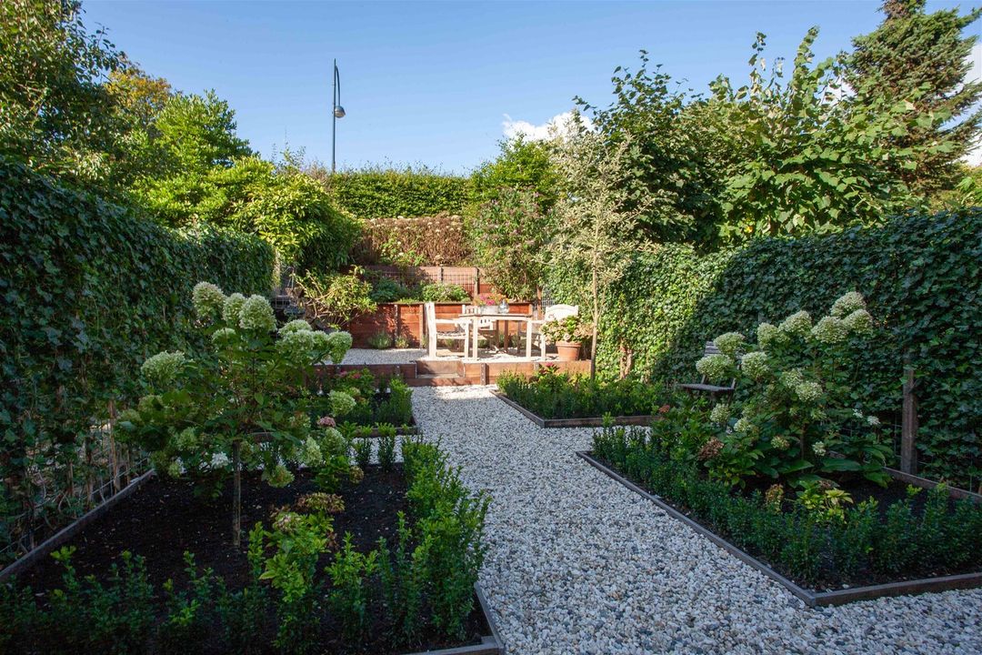 De tuin is speels ingericht en voorzien van bordes met volwassen beplanting, grindpaden en het terras is bestraat.