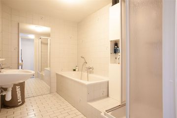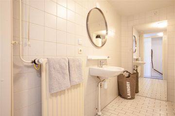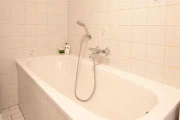 De badkamer is voorzien van een douchecabine, een wastafel, een radiator en een ligbad met douche!