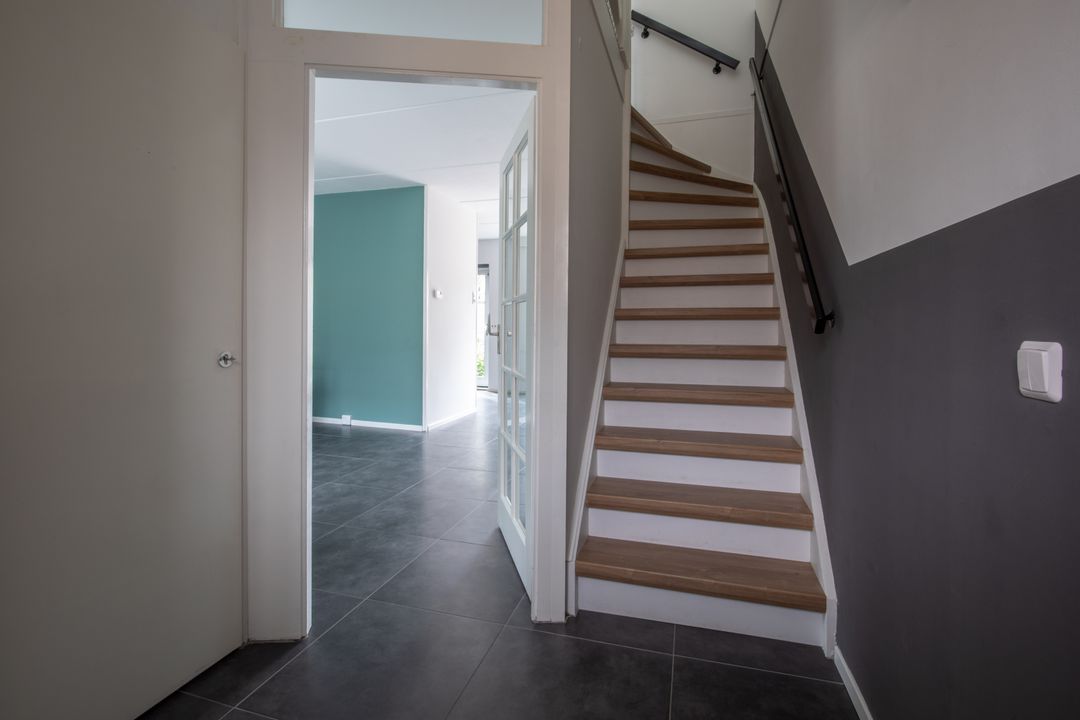 Via de voortuin met oprit bereikt u de entree van de woning. De hal geeft toegang tot het toilet met fonteintje, de meterkast, de trapopgang en de woonkamer.
