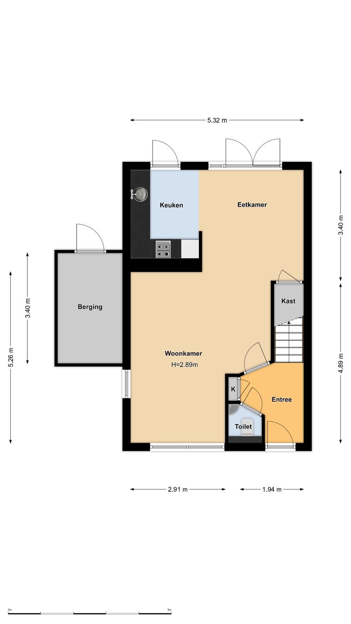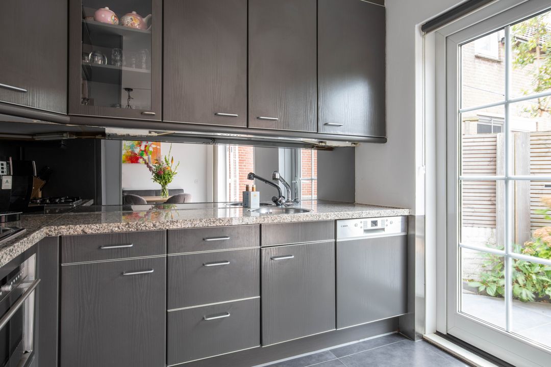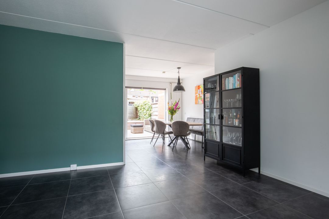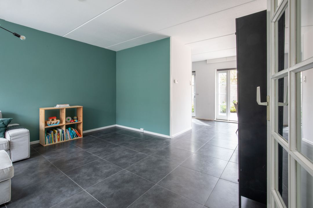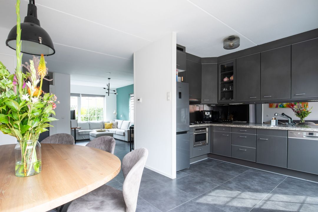 – Fijne woonkamer met een open keuken en openslaande deuren naar de achtertuin;