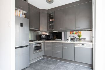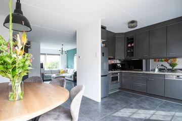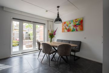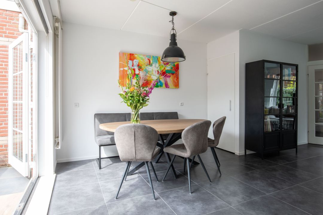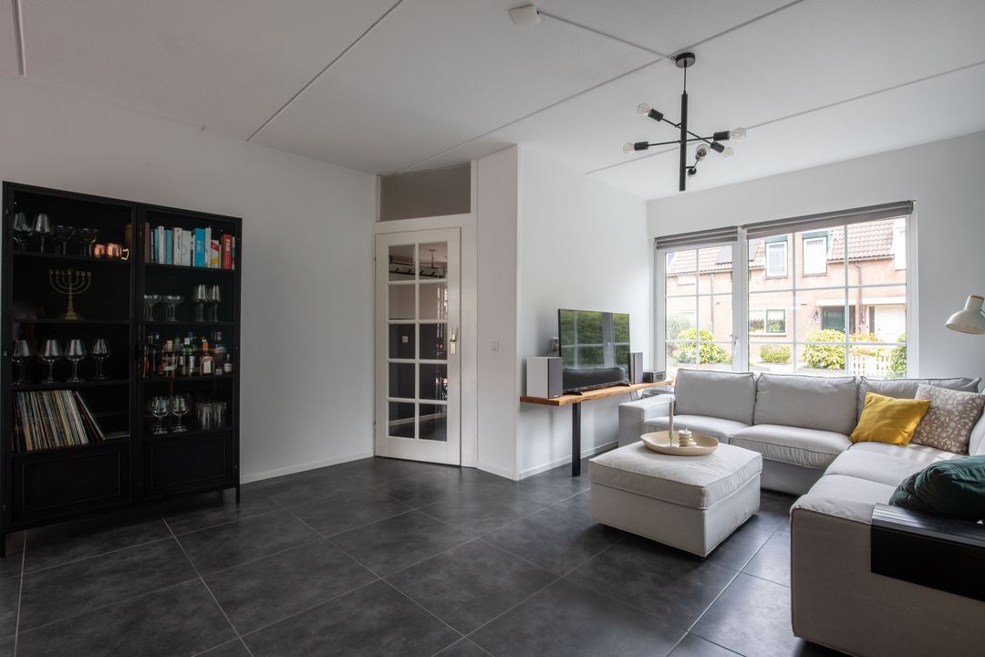 Het zitgedeelte bevindt zich aan de voorzijde van de woning. Dankzij de hoekligging met een extra zijraam en de raampartijen met roedeverdeling profiteert de woonkamer van een prettige natuurlijke lichtinval. Aan de achterzijde is het eetgedeelte met aansluitend de open keuken. De keuken is uitgerust met een 4-pits gaskookplaat, vaatwasser, oven en koelkast/vriezer. Via openslaande deuren is de achtertuin bereikbaar. De gehele begane grond is voorzien van een moderne plavuizen tegelvloer.