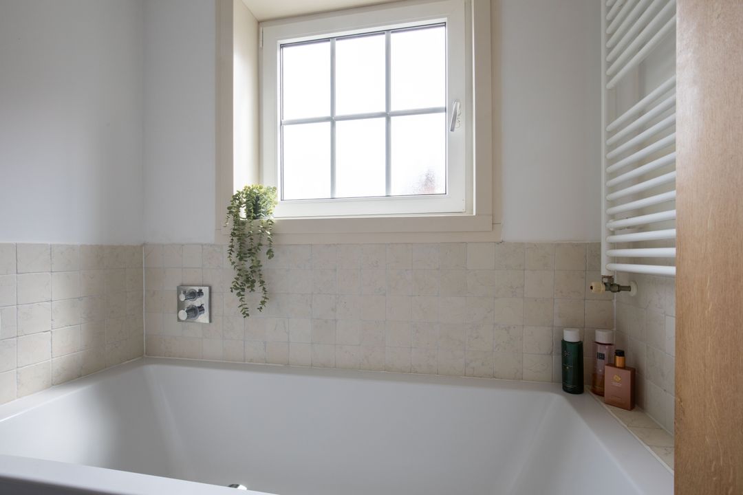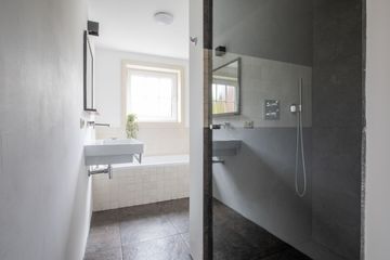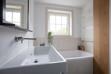 De badkamer is netjes afgewerkt en beschikt over een stortdouche, ligbad, wastafel en toilet. De badkamer heeft een natuurlijke lichtinval dankzij het raam.