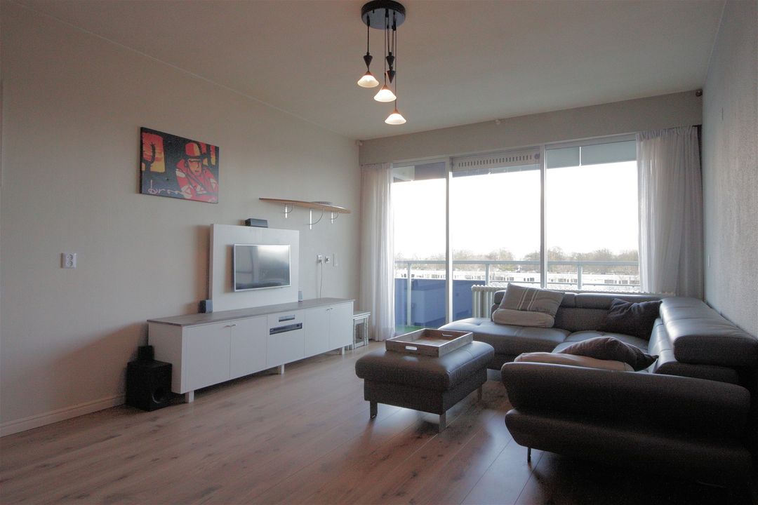 De woonkamer: Een fijne woonkamer met open keuken en een schuifpui naar het balkon. De gehele woning is afgewerkt met een keurige laminaatvloer en gestucte wanden.