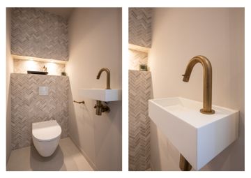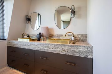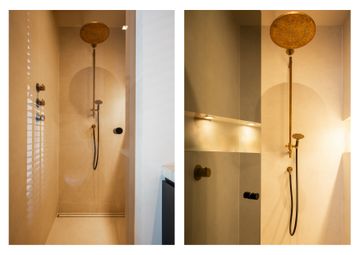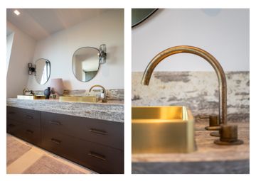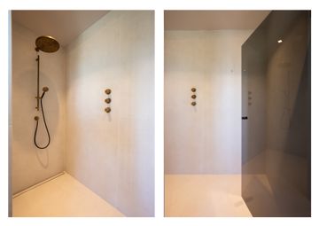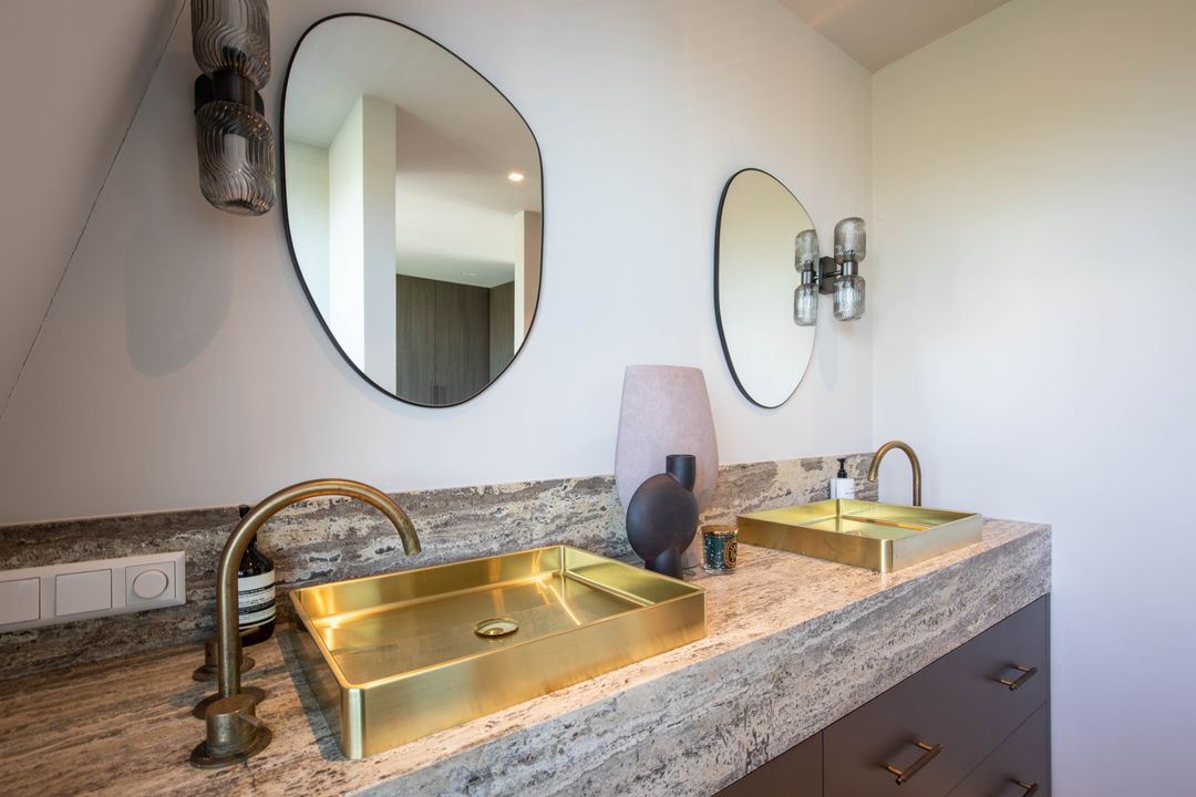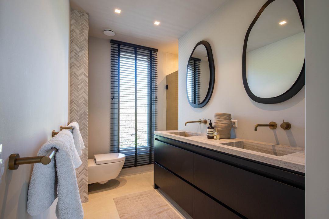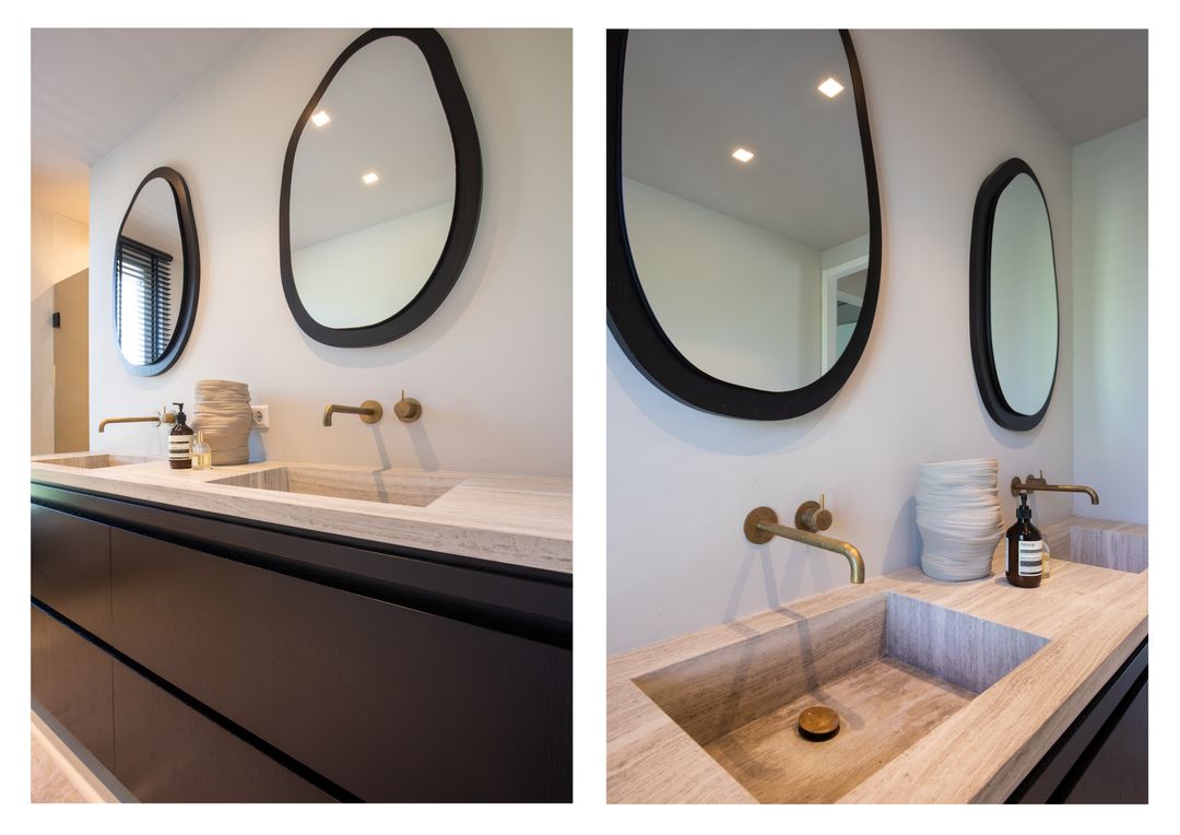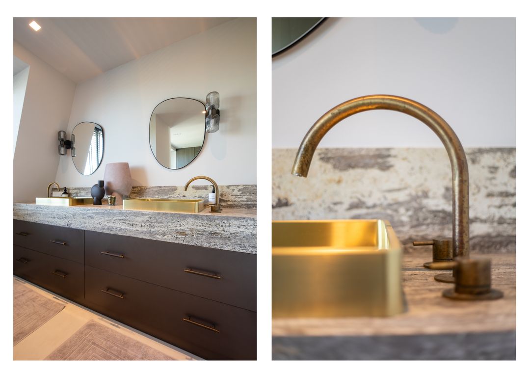 De aangrenzende inloop badkamer straalt pure klasse uit met een breed wastafelmeubel van marmer. Hierop staan twee messing wastafels met messing kranen. Het meubel heeft tevens vier grote lades, twee mooie spiegels en luxe design wandlampen. De inloop regendouche is voorzien van een grote regendouchekop en handdouche, de kranen zijn ook hier mooi weggewerkt in de wand. Ook deze badkamer is voorzien van een toilet.