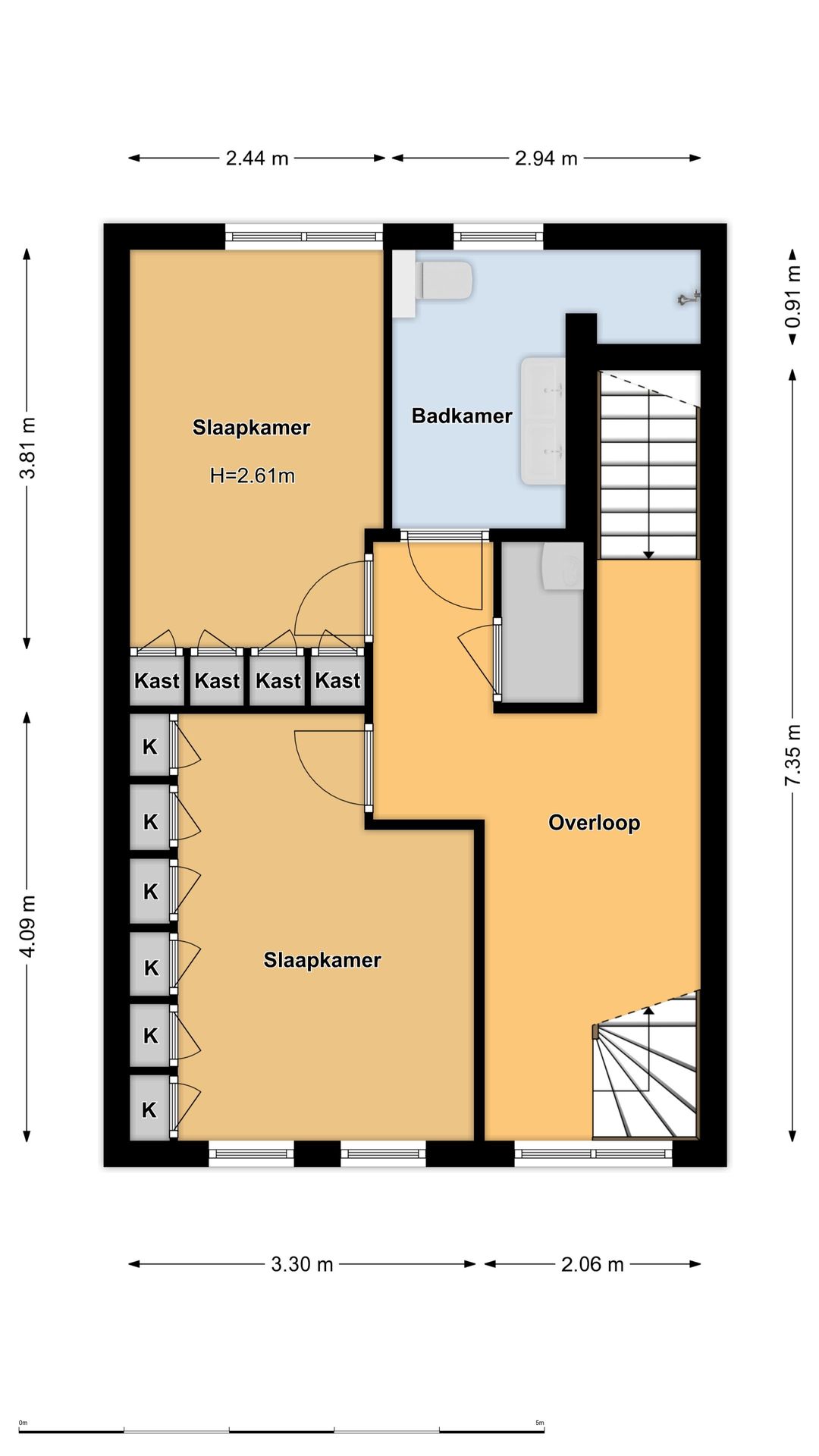 De tweede verdieping biedt twee ruime slaapkamers met prachtige maatwerk kastenwanden.