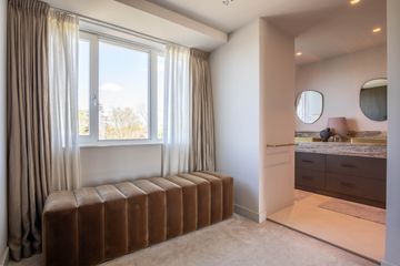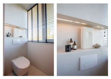 Een heerlijk spa-gevoel krijgt u in de luxueuze badkamer, voorzien van een breed wastafelmeubel met marmer blad voorzien van twee wastafels, vier grote opberglades en twee prachtige spiegels. De inloop-regendouche is riant te noemen; de kranen zijn fraai weggewerkt in de muur en de douche is voorzien van een grote messing regendouchekop en een handdouche. Het toilet mag hier natuurlijk niet ontbreken. De ruimte heeft een natuurlijke lichtinval.