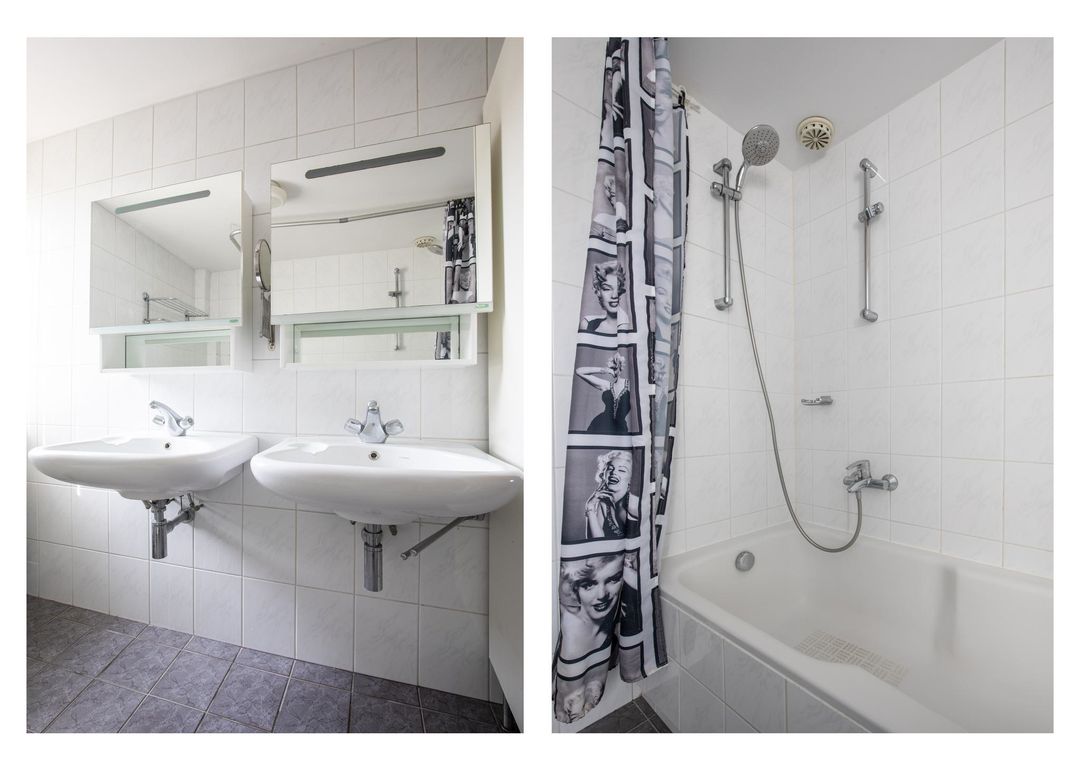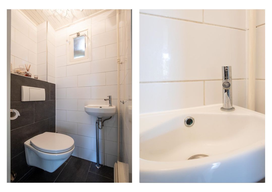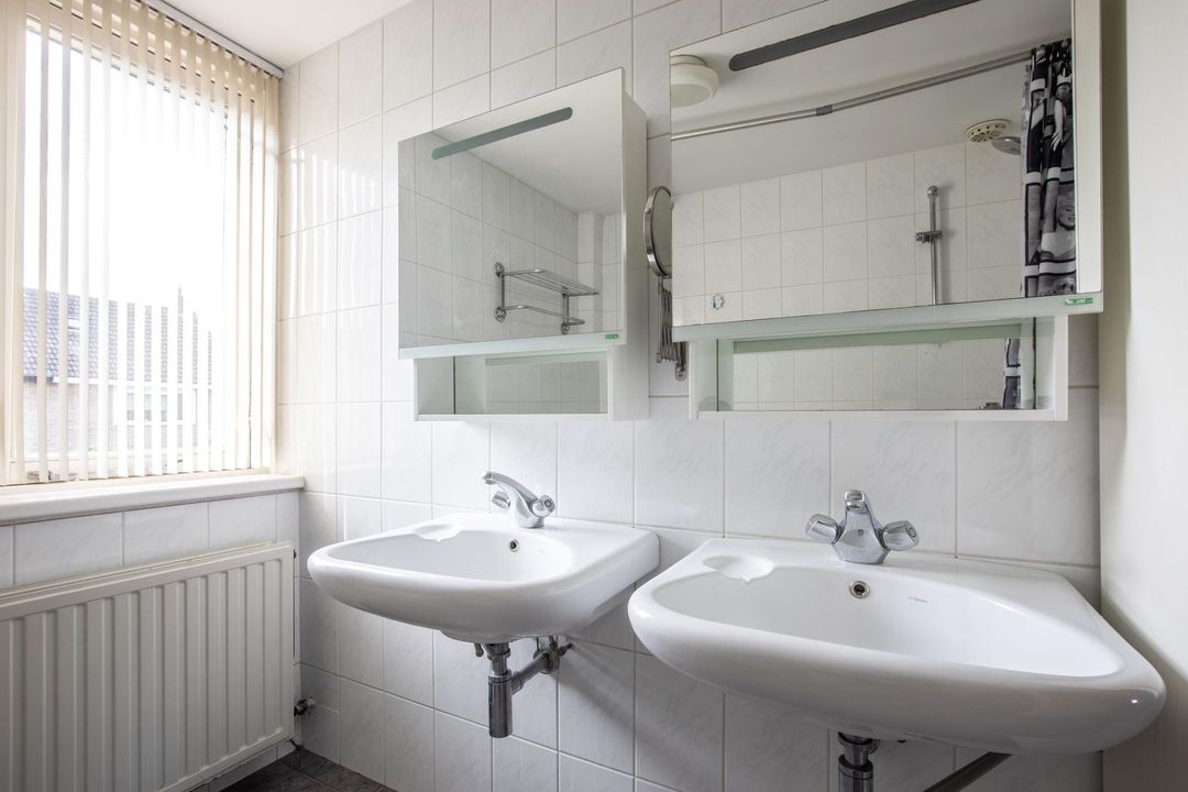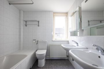De badkamer is eveneens gelegen aan de voorzijde en voorzien van een ligbad, een douche, een breed wastafelmeubel met twee wastafels een kast en een toilet. De ruimte is geheel betegeld en heeft een natuurlijke lichtinval.