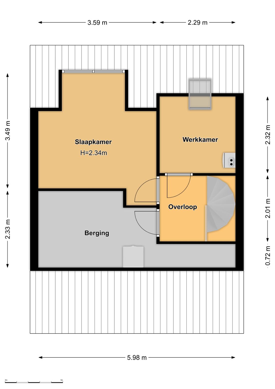 Op de tweede verdieping treft u de vierde slaapkamer. Deze kamer is vergroot middels een dakkapel. Op deze verdieping bevindt zich veel bergruimte. Het is mogelijk hier een vijfde slaap/werkkamer te creëren.