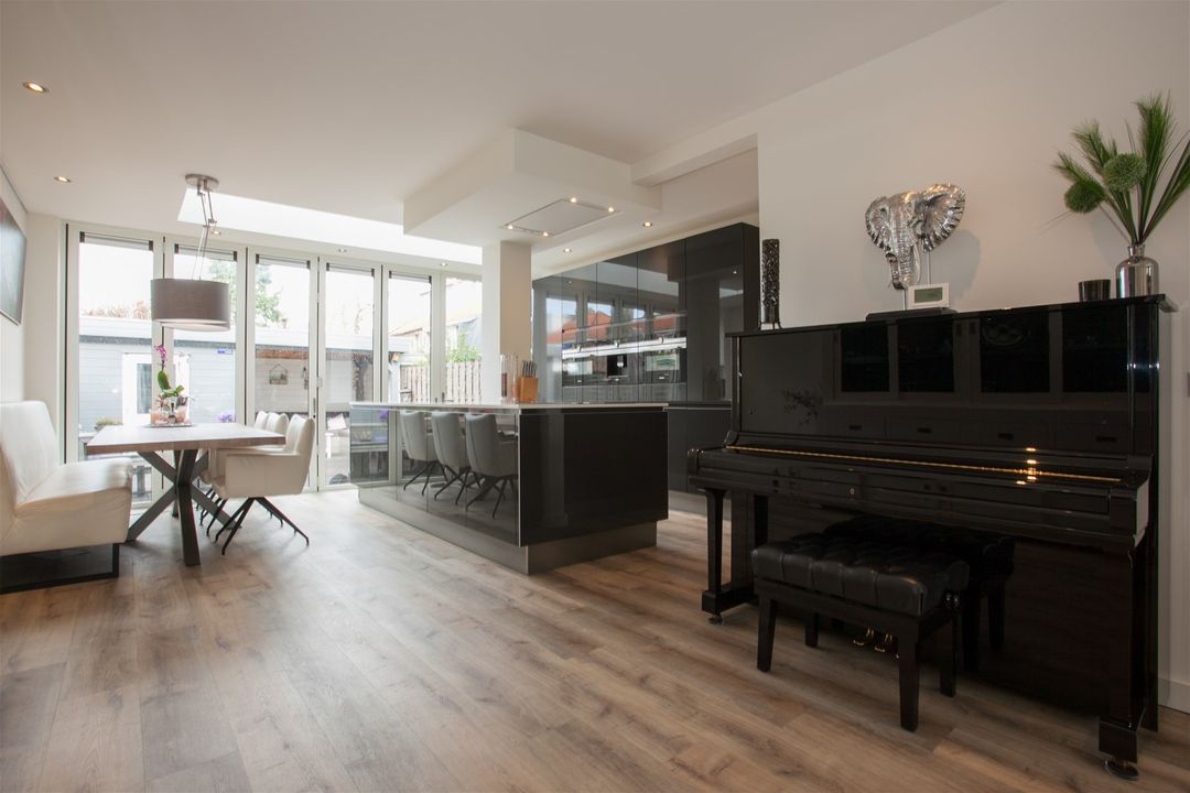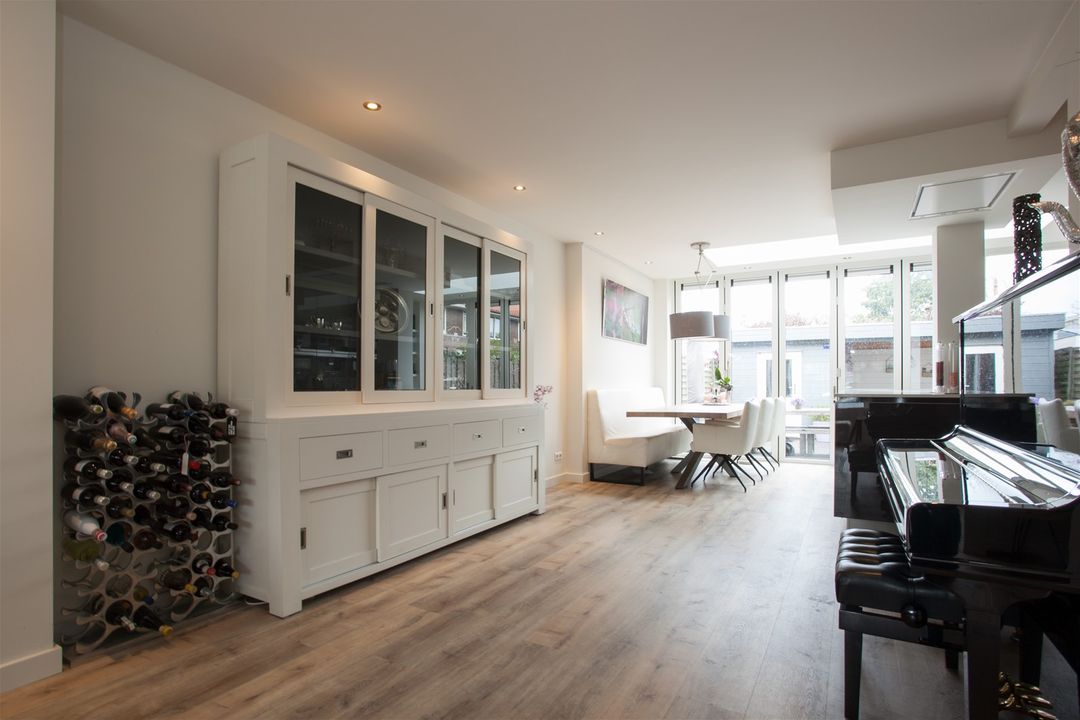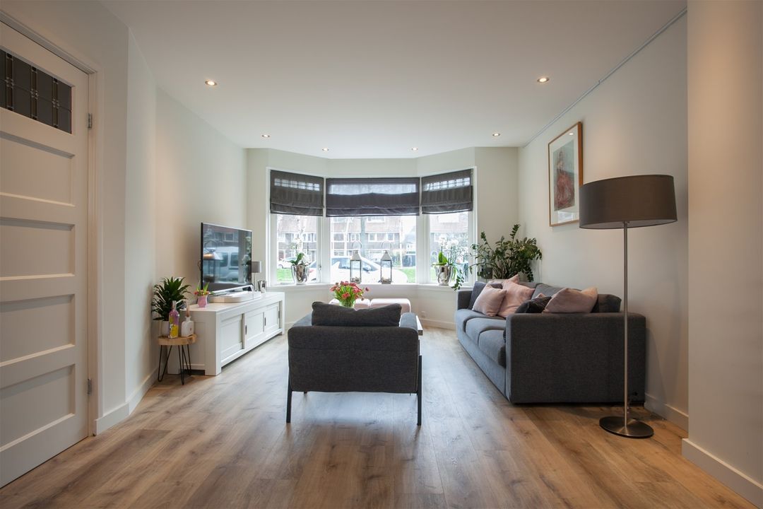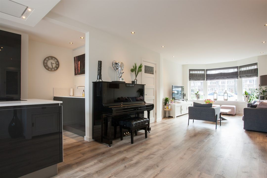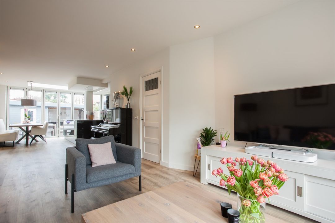 Wat een fijne lichtinval in de woonkamer! De woonkamer heeft een erker aan de voorzijde, een lichtstraat in de uitbouw en een harmonica schuifpui aan de achterzijde. De achterpui kan hierdoor geheel open.