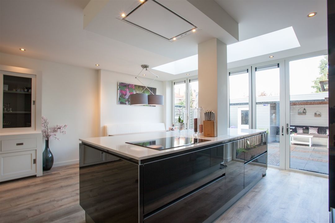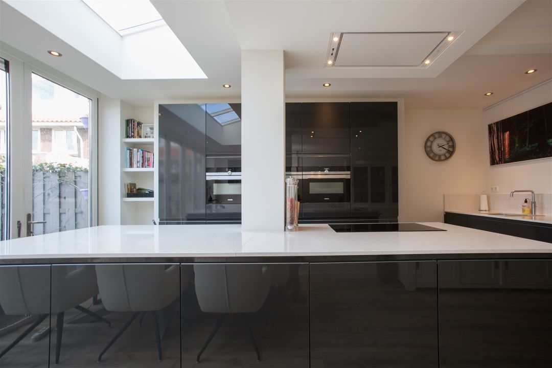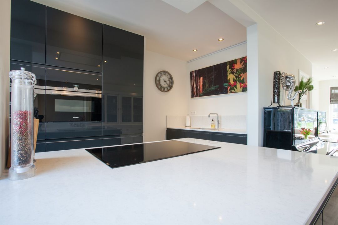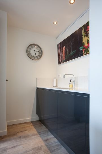 De keuken is uitgerust met een 4-pits inductiekookplaat, een in het plafond geïntegreerde afzuiging, een Quooker combi kraan, een vaatwasser, een oven, een combi-oven/magnetron, een koffiemachine, een koelkast en een vriezer. Onder het kookeiland is led-verlichting aangebracht op een draadloze schakelaar.