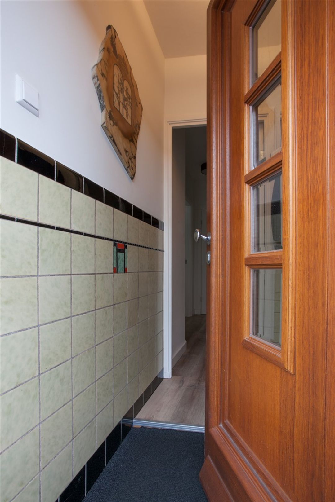 In de hal valt meteen het behoud van de originele elementen op. In het tochtportaal zijn de tegels bij de renovatie behouden.