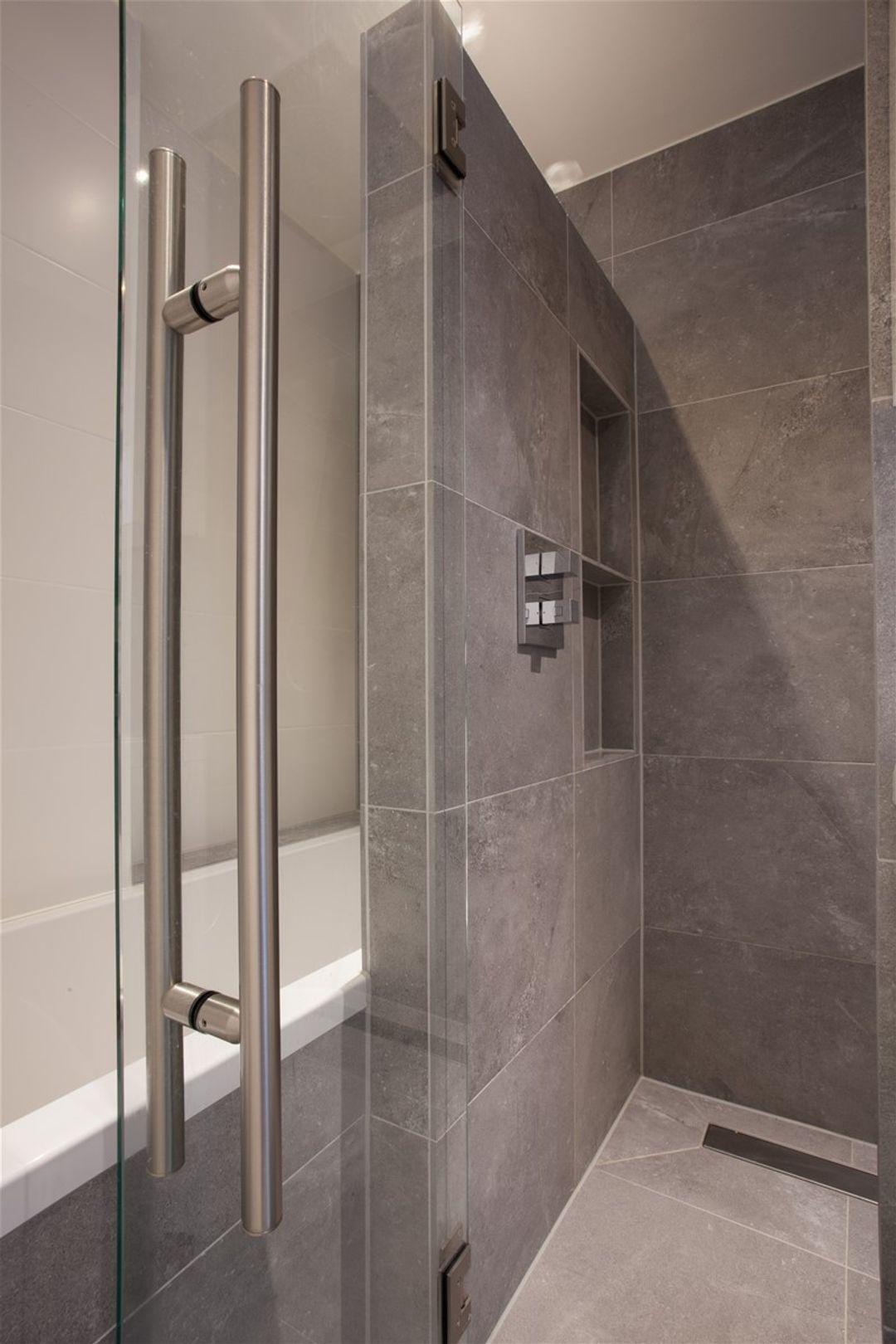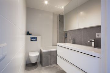 De moderne en luxe uitgevoerde badkamer is voorzien van een ligbad, een inloopdouche met glazen deur, een toilet, een brede wastafel met twee kranen en een spiegelkast met elektra.