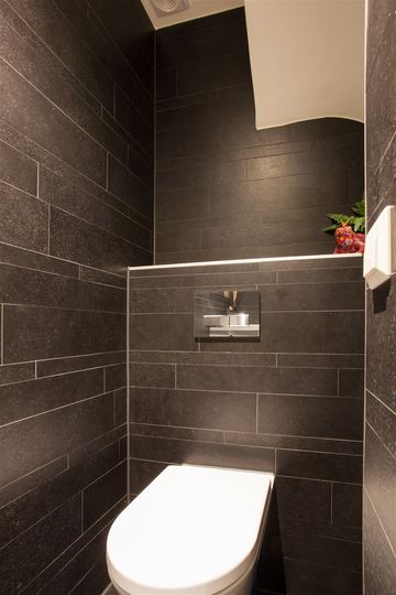 Het moderne toilet met fonteintje en meubel is vergroot en volledig betegeld.