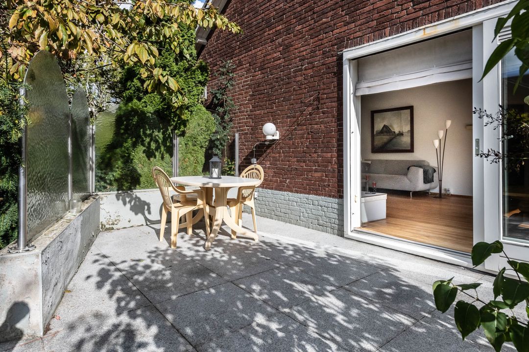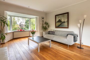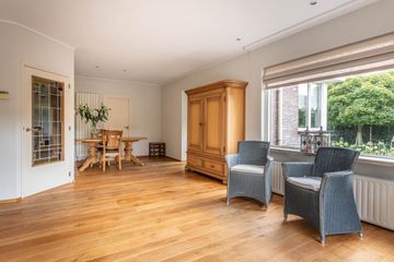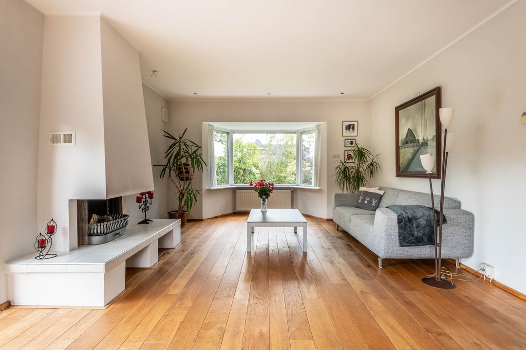 De woonkamer ligt over de volledige lengte van de woning en heeft een lichte en warme uitstraling. De eiken houten vloer, de gashaard met schouw en de erker creëren een prettige leefruimte. De schuifpui naar de tuin zorgt voor een fijne natuurlijke lichtinval en een directe verbinding met buiten.