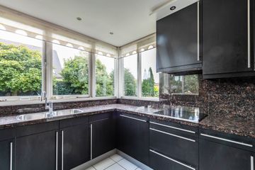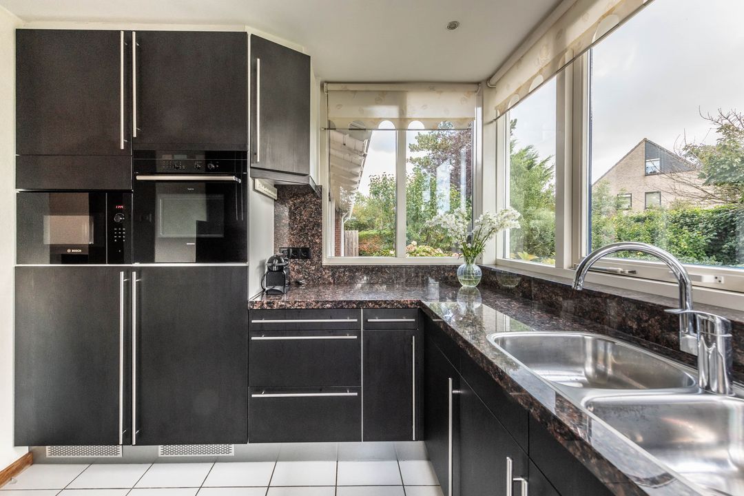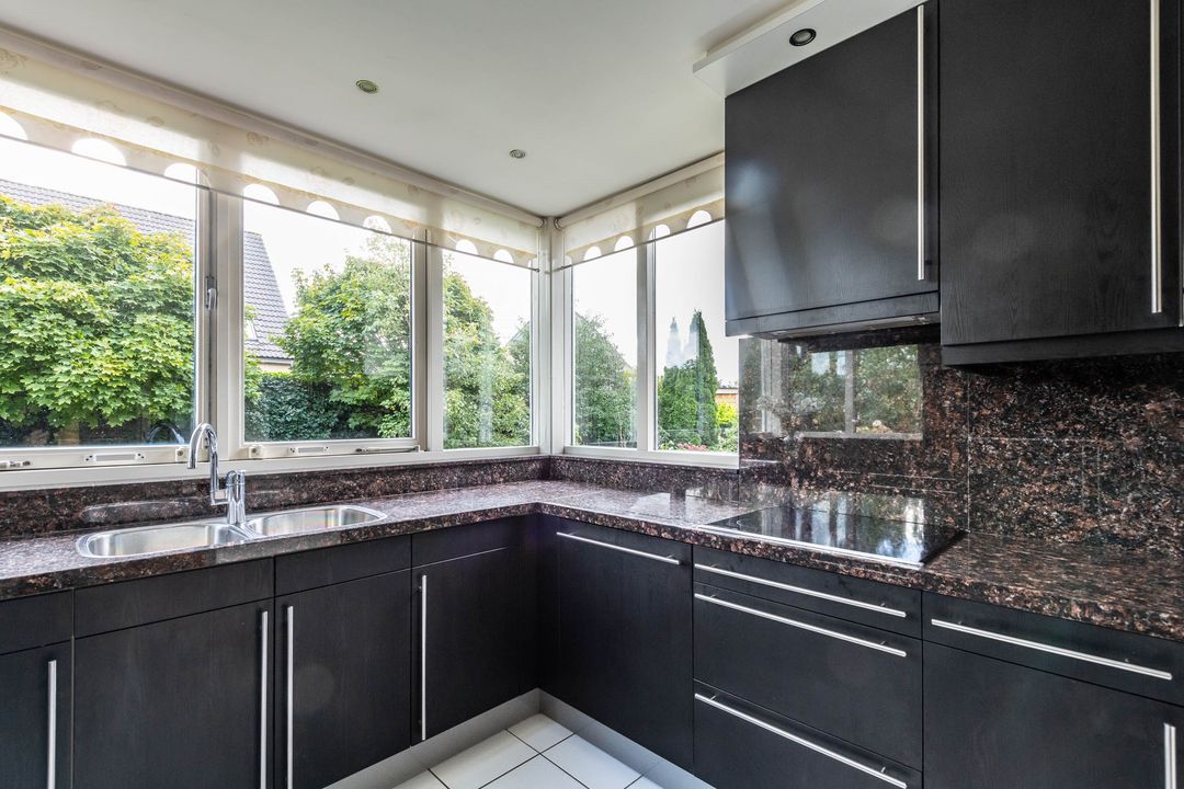 De open keuken is geplaatst in een ruime aanbouw en heeft een praktische U opstelling. De keuken is uitgerust met diverse inbouwapparatuur waaronder een inductie kookplaat, vaatwasser, koelkast, vriezer, magnetron en oven. De keuken heeft vloerverwarming en biedt veel werkruimte en opbergruimte.