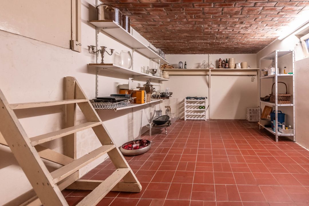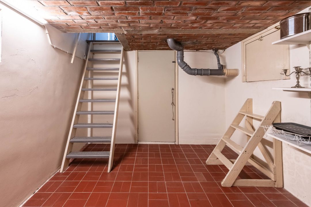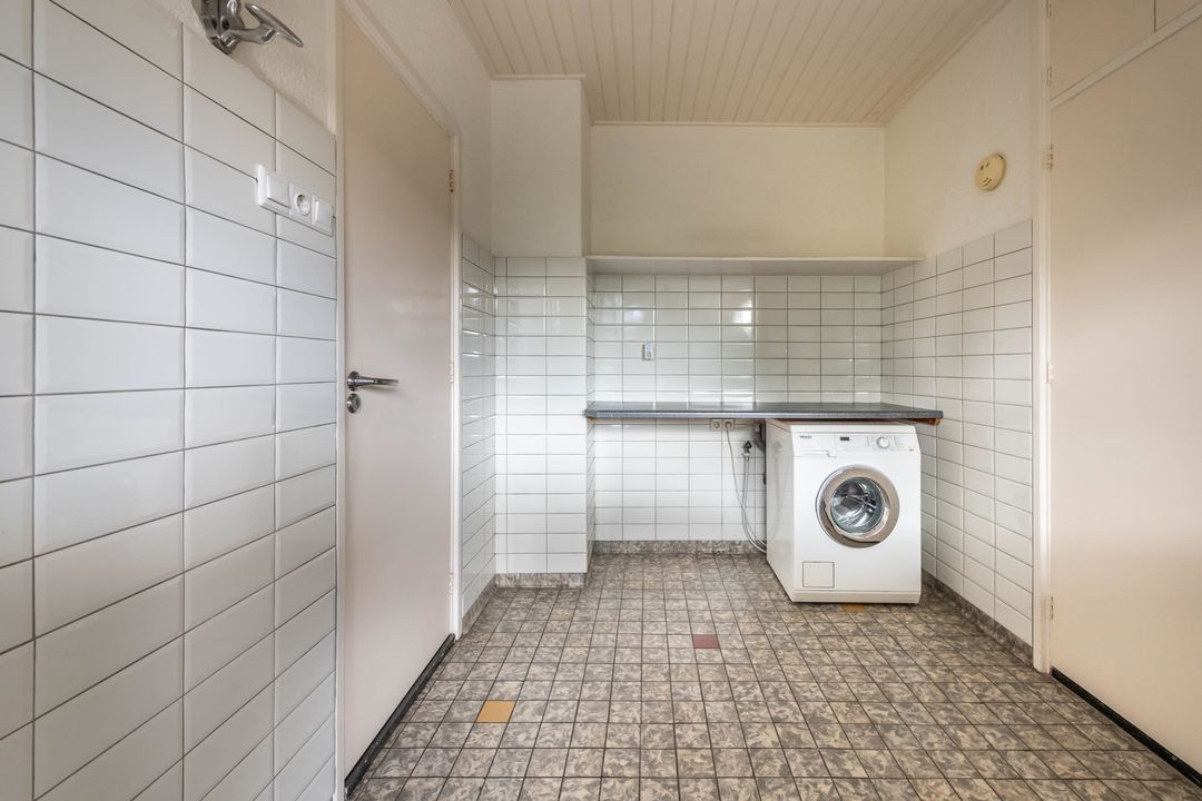 Vanuit de eethoek is de wasruimte bereikbaar. Hier bevinden zich de aansluitingen voor de wasmachine en de droger, de achterdeur naar de tuin en de toegang tot de kelder. De kelder is ongeveer 2,7 meter bij 4,3 meter en heeft een stahoogte van 1,85 meter. In de kelder staat de cv ketel opgesteld.