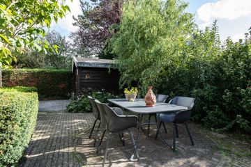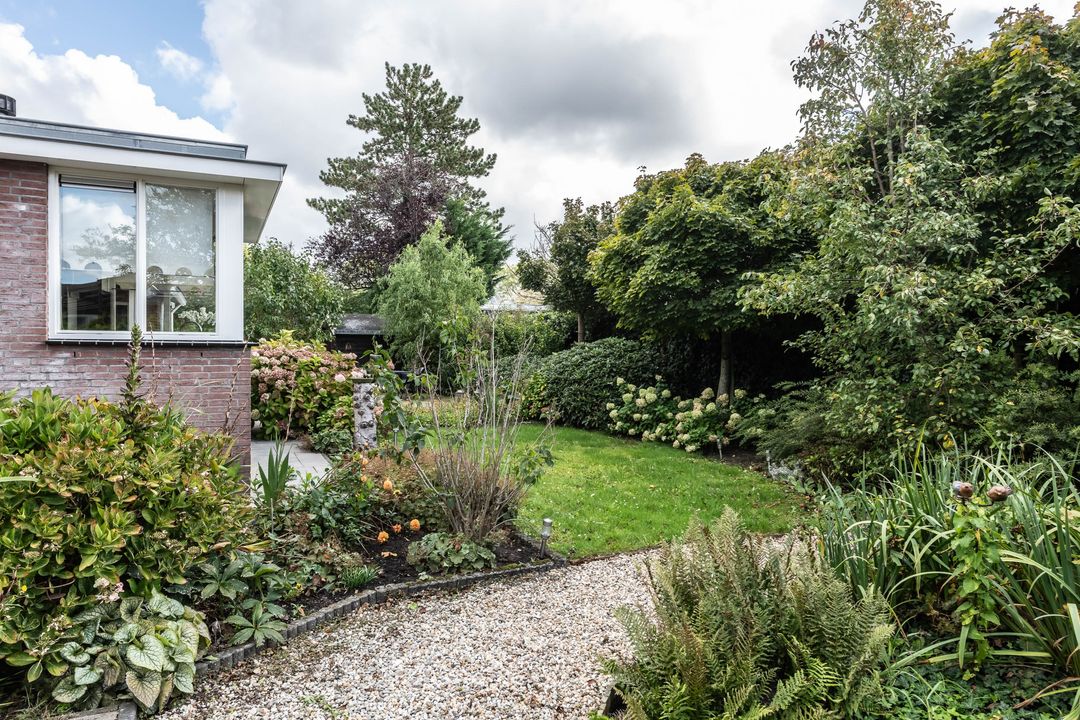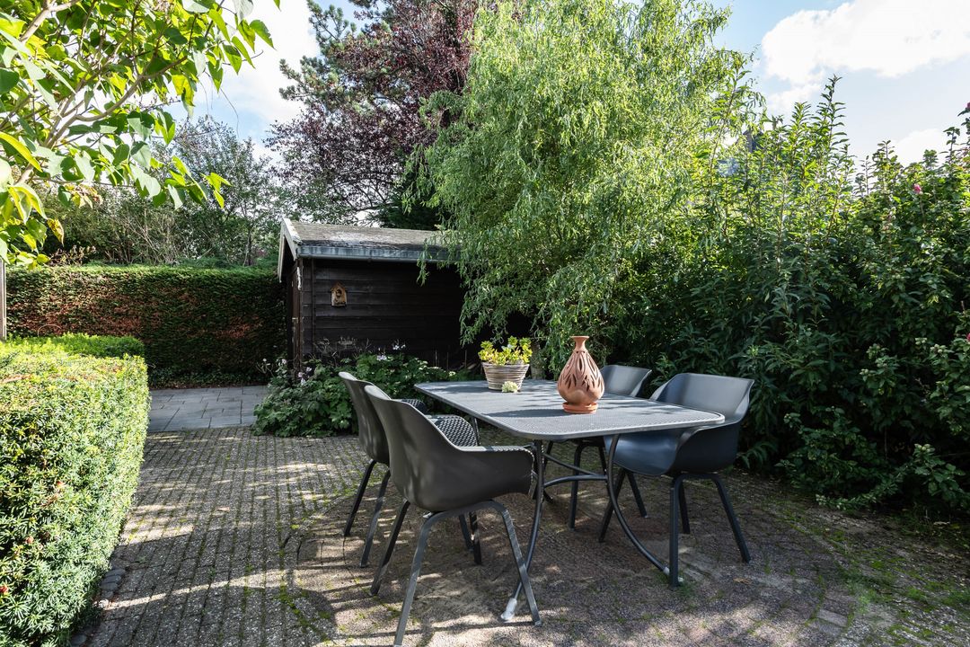 De woning heeft een fraai aangelegde tuin rondom met meerdere terrassen en zitplekken. De voortuin ligt aan een groen plantsoen en heeft een prettige vrije ligging. De achtertuin op het zuidoosten biedt veel privacy en heeft zowel zon als schaduwplaatsen. In de tuin staat een vrijstaand houten schuurtje voor extra opslag.