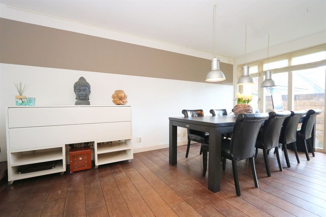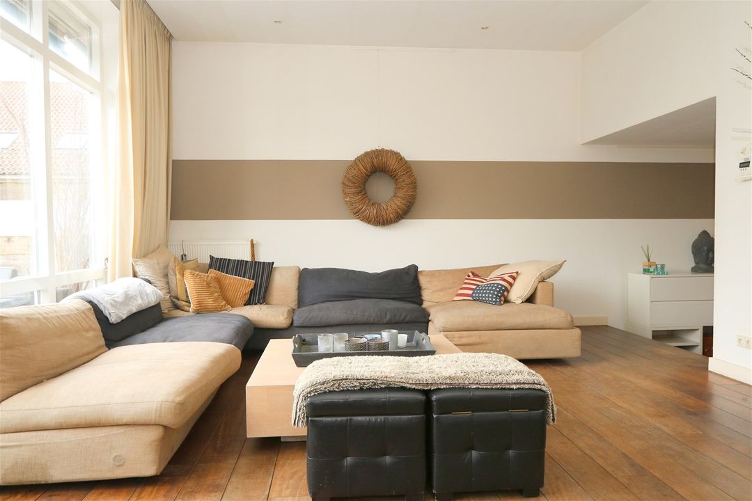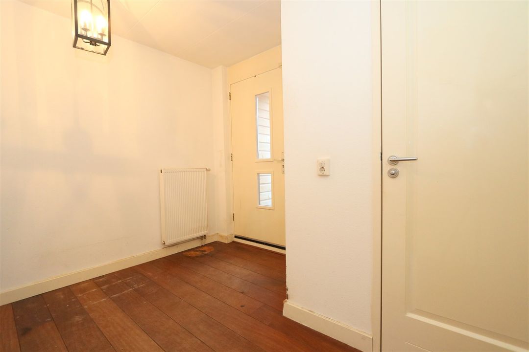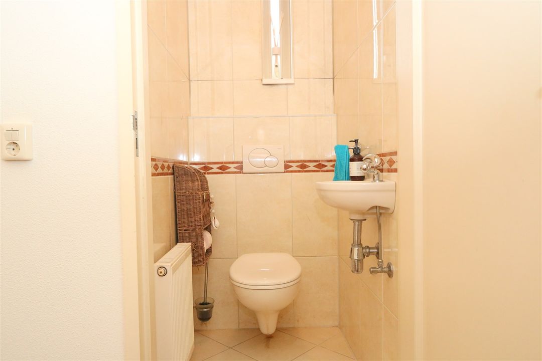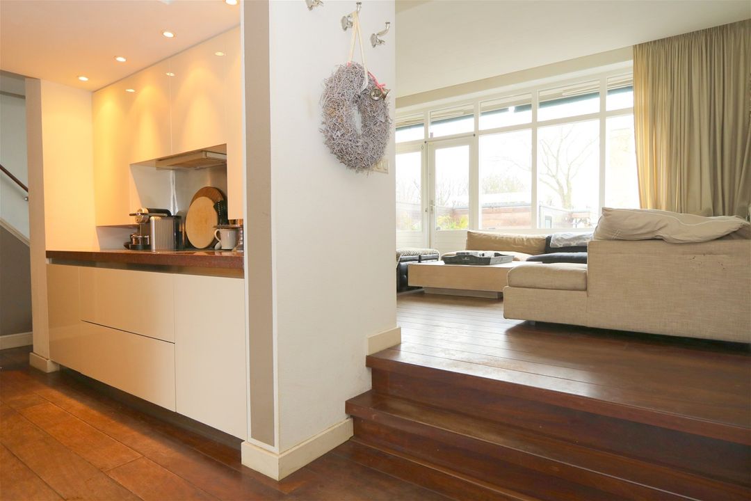 Entree, hal, toilet met fonteintje. Deze sfeervolle woning beschikt over een ruime woonkamer en keuken met houten vloer. Doordat het een splitlevel woning is zijn er meerdere gezellige hoekjes te creëren op de begane grond. Door de grote ramen is de woonkamer heerlijk licht en heeft u mooi uitzicht op de tuin.