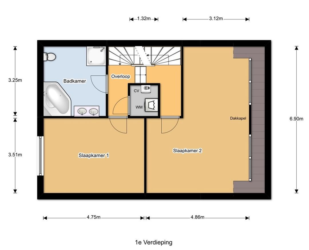 De eerste etage beschikt over twee slaapkamers, waarvan de master-bedroom aan de achterzijde is gelegen. Deze slaapkamer heeft een prachtige inbouwkast en een grote dakkapel waardoor nog meer ruimte is gerealiseerd. Beide slaapkamers zijn voorzien van rolluiken, dubbelglas en gestucte wanden.