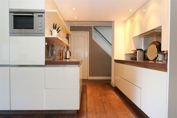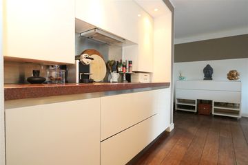 De moderne keuken is voorzien van een keramische kookplaat, afzuigkap, vaatwasser en oven. Aangrenzend aan de keuken is er plaats voor een grote eethoek en is er direct contact mogelijk met uw gasten mogelijk terwijl u staat te koken. Op dit niveau is er ook een praktische trapkast aanwezig.