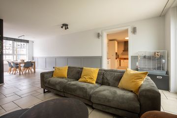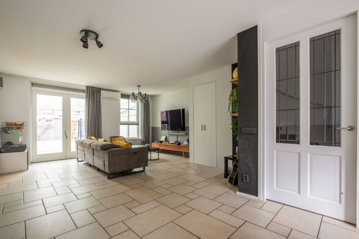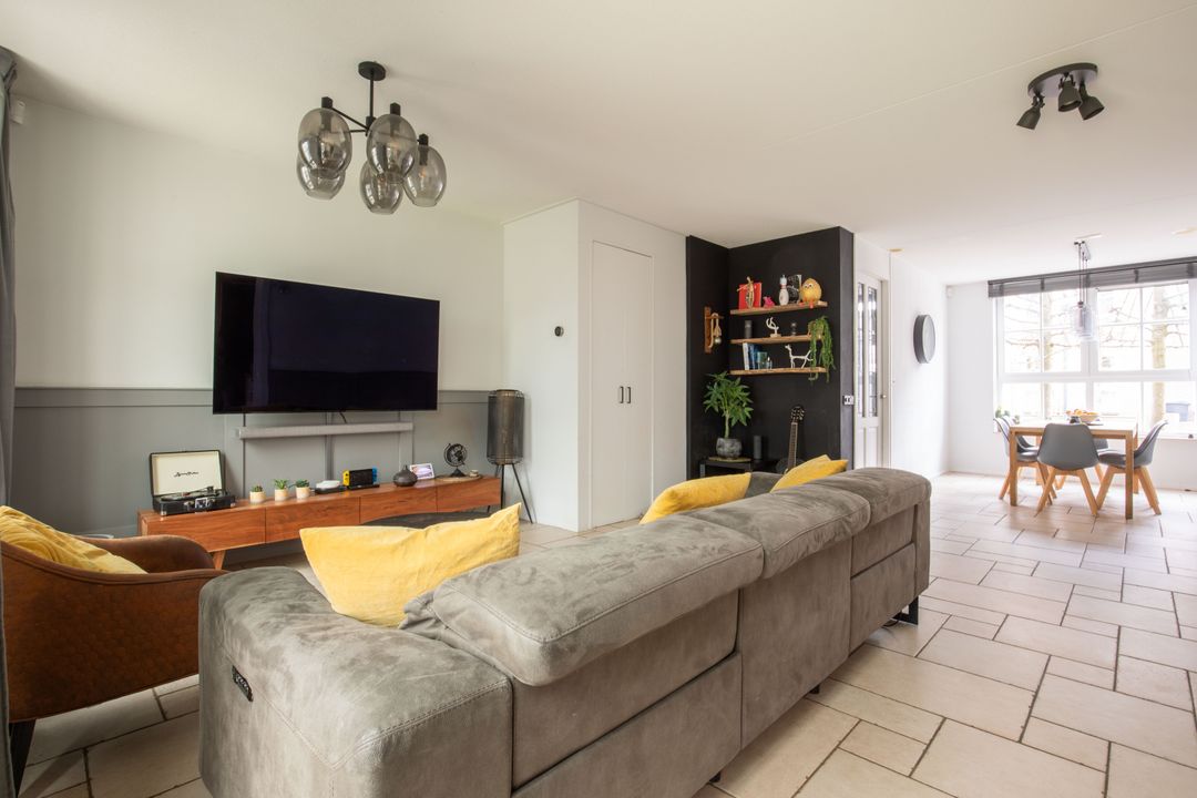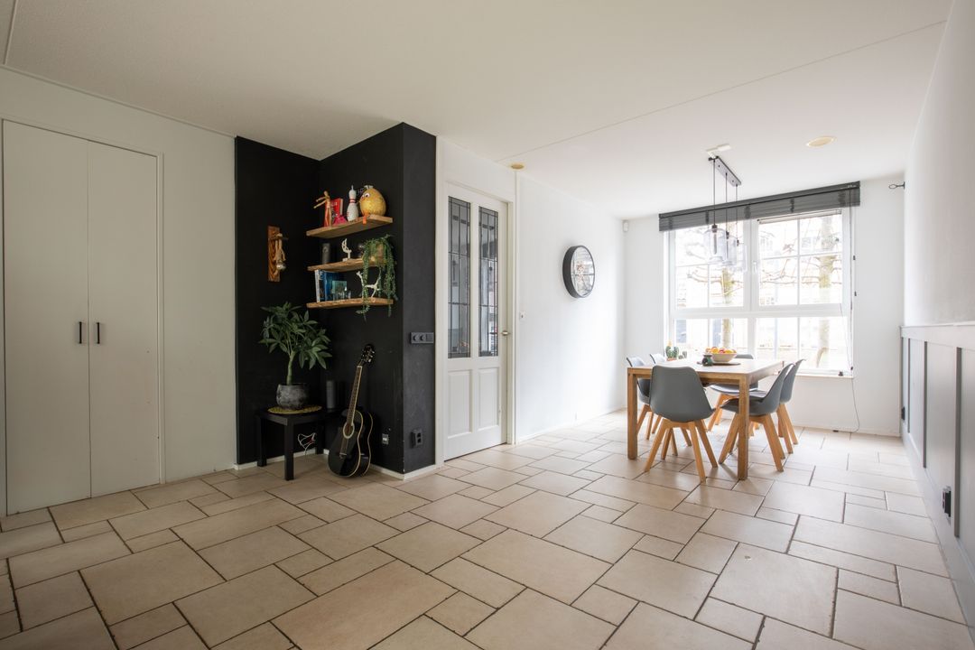 De woonkamer is voorzien van een onderhoudsvriendelijke plavuizen vloer voorzien van vloerverwarming. De eethoek is gesitueerd aan de voorzijde, hier is voldoende plek voor een grote eettafel. De living bevindt zich aan de achterzijde en heeft openslaande deuren naar de verzorgde achtertuin.