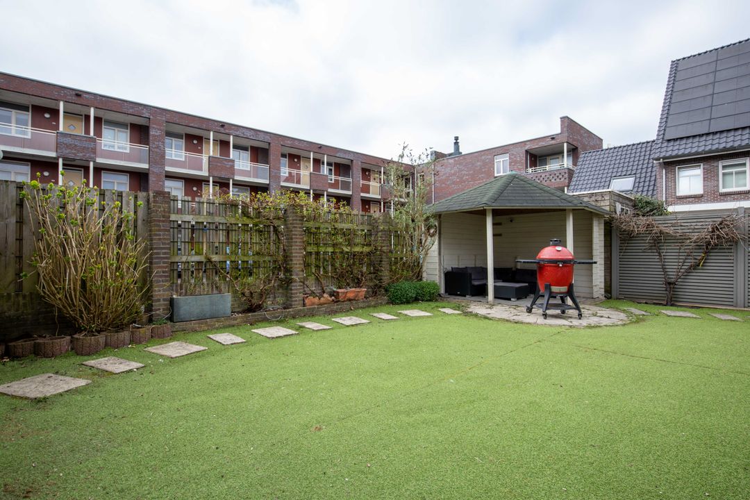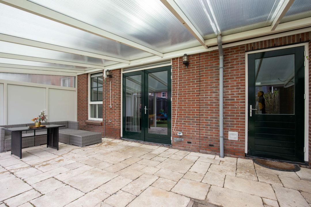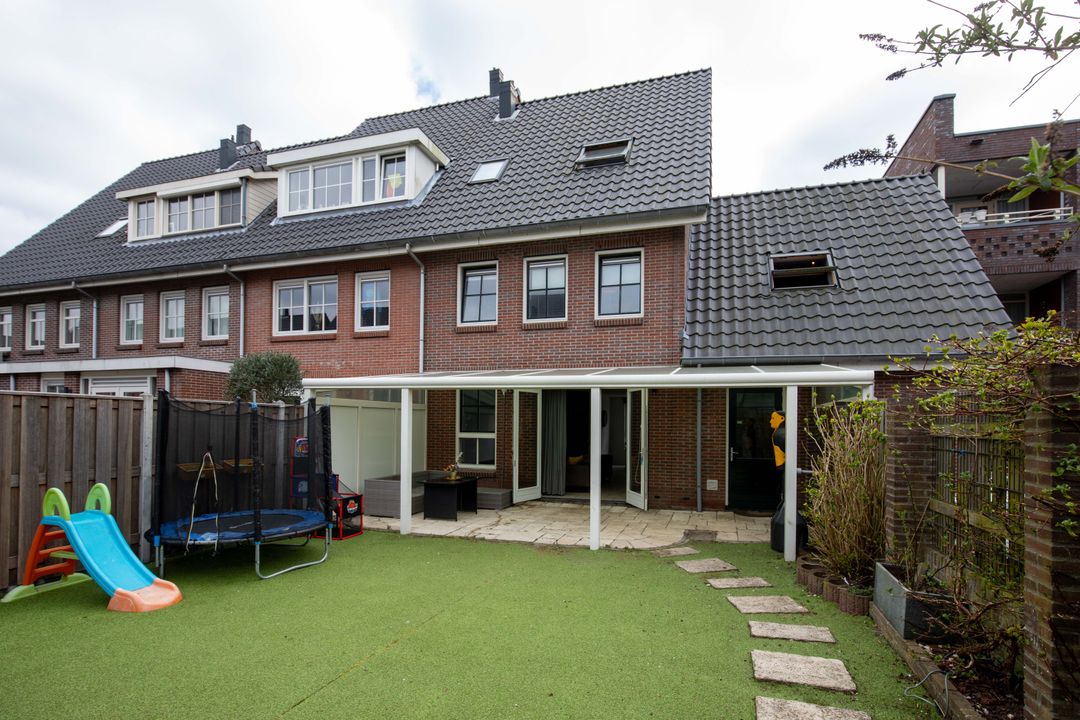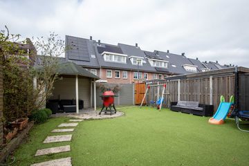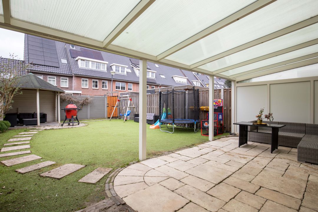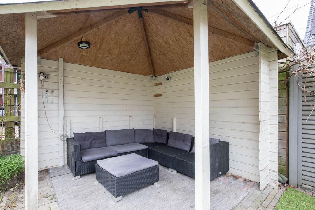 Direct aan de achterzijde van de woning bevindt zich een fraaie overkapping met kunststofpanelen (30% zonwerend) dak, hier kun je al vroeg in het voorjaar heerlijk buiten vertoeven. Ook achter in de tuin tref je een fijne loungeplek onder een overkapping. Er is meer dan voldoende ruimte voor een grote eettafel met BBQ of speelattributen voor de kinderen. De tuin is onderhoudsvriendelijk en heeft een achterom.