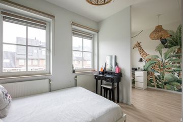 Via de trap in de hal bereik je de eerste verdieping waar zich drie slaapkamers (oorspronkelijk 4) en de badkamer bevinden. Dankzij de dakopbouw op de garage heeft deze woning een extra slaapkamer, dit is de masterbedroom. Deze kamer heeft een dakraam aan de achterzijde en een sfeervolle dakkapel aan de voorzijde. De overige twee slaapkamers zijn ruim van afmeting en hebben een prettige lichtinval. Op de overloop bevindt zich een grote vaste kast. Over de gehele verdieping ligt een nette laminaatvloer. De badkamer is uitgerust met een ligbad, een douche, een wastafelmeubel met lades, fraai ingebouwde thermosstaat kranen en een toilet. De ruimte is grotendeels betegeld en heeft een natuurlijke lichtinval.