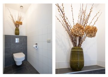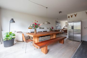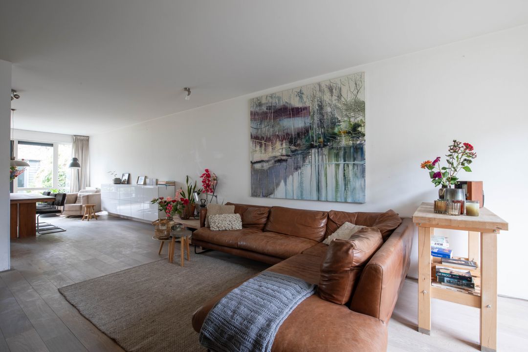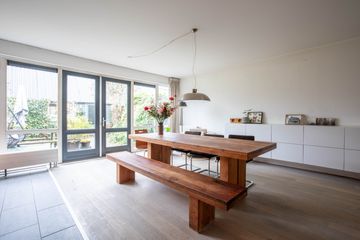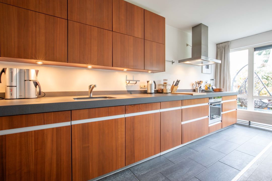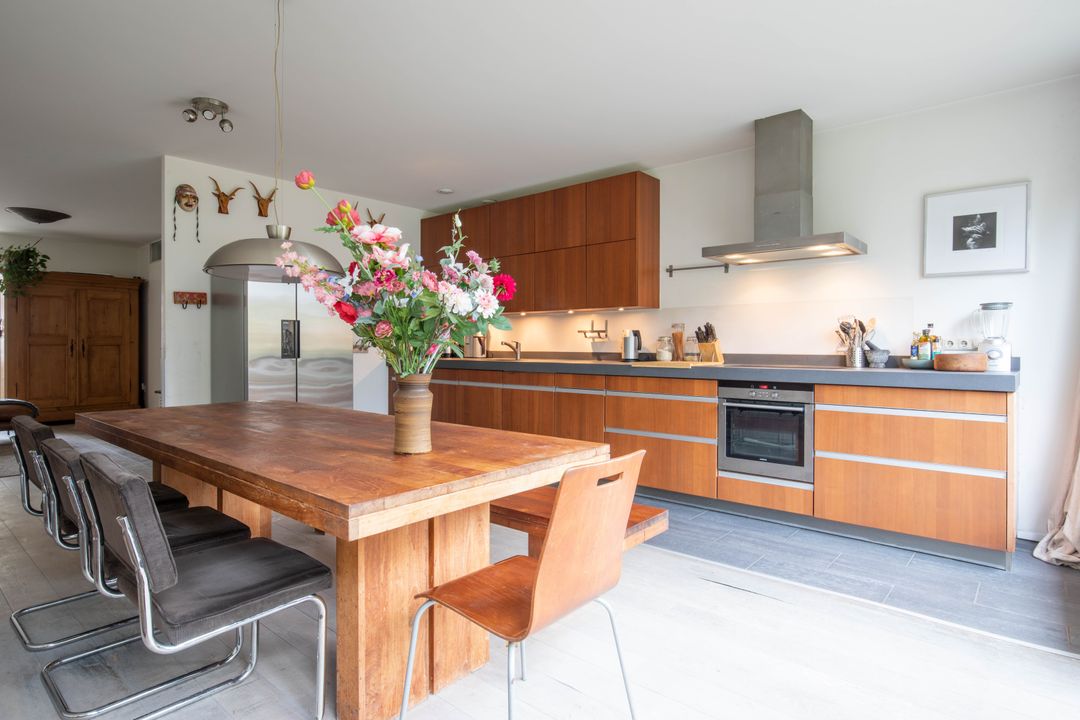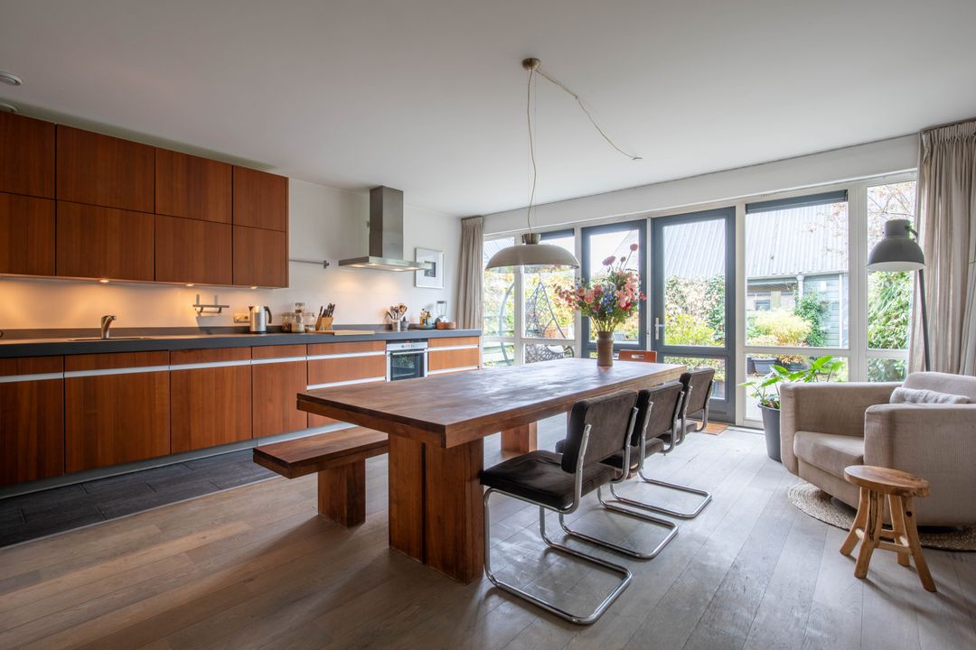 De uitgebouwde woonkeuken is tuingericht en heeft openslaande deuren naar de tuin. Deze woonkeuken is een heerlijke plek om te vertoeven. Je hebt hier een zee aan ruimte voor een grote eettafel met veel zitplaatsen. De keuken is uitgerust met een 4-pits inductiekookplaat met warmhoudplaat, een afzuigkap, een vaatwasser en een oven. Een sfeervolle ruimte om menig gezellig etentje te organiseren voor familie en/of vrienden! Aan de keuken/aanrechtzijde ligt een strook met grijze tegels, wel zo praktisch en makkelijk schoon te houden!