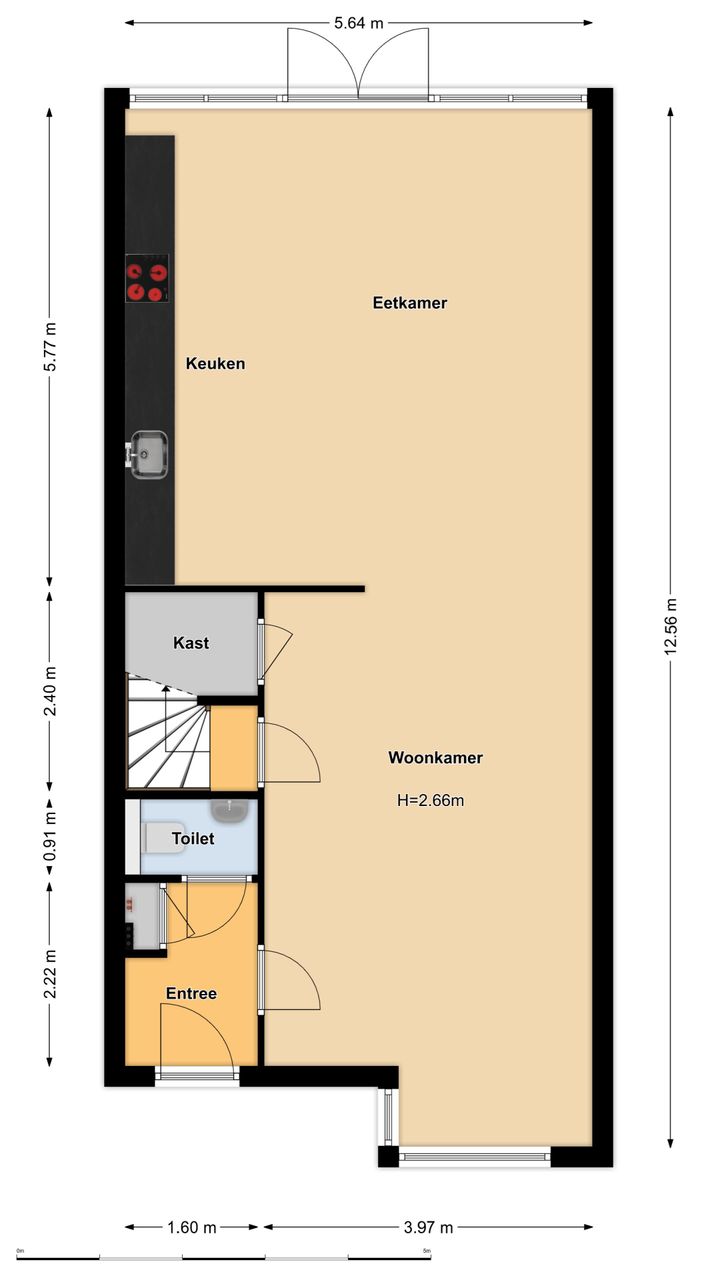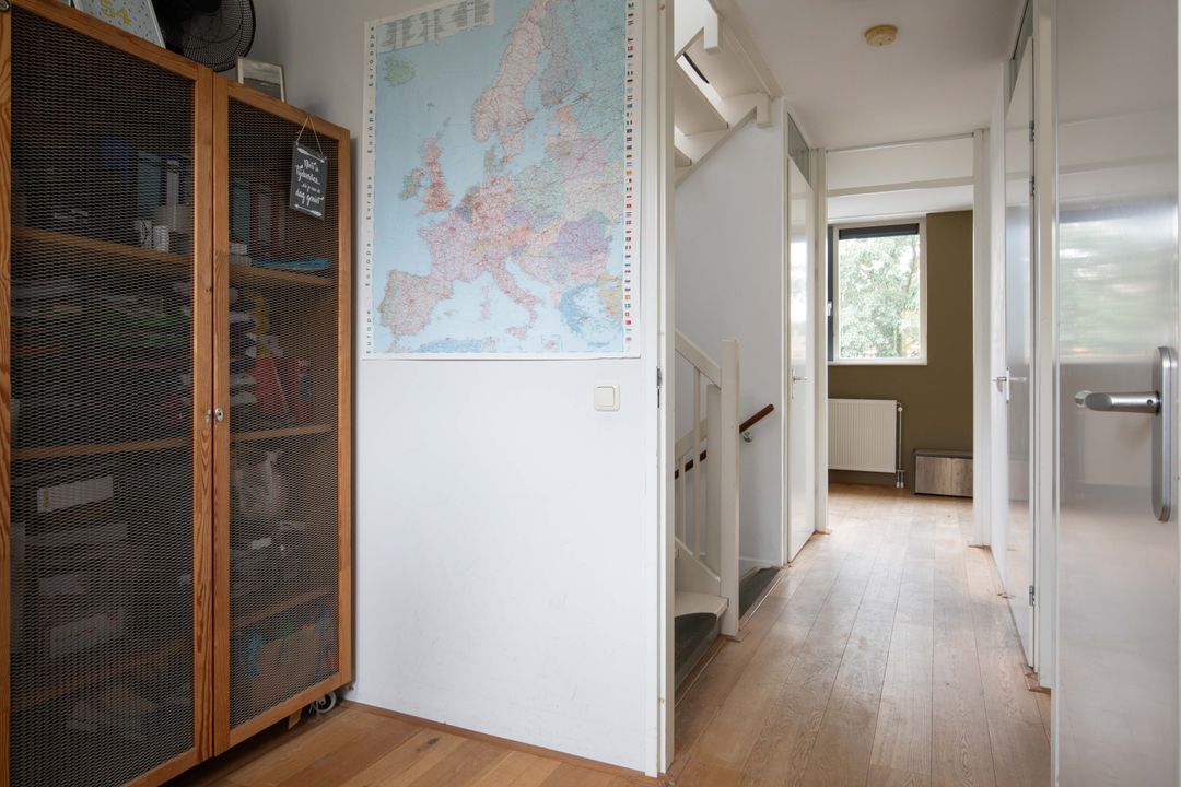 Via de voortuin bereik je de entree van de woning. In de hal bevinden zich de meterkast en het toilet met fonteintje. De uitgebouwde woonkeuken is tuingericht en heeft openslaande deuren naar de tuin. Aan de voorzijde bevindt zich de woonkamer. De erker aan de voorzijde zorgt voor een prettige lichtinval. Op de vloer ligt een lamelparket in een warme kleurstelling. De trapkast is praktisch voor de spullen die je niet direct in het zicht wil hebben. Tevens tref je hier een deur met de trap naar de eerste verdieping.