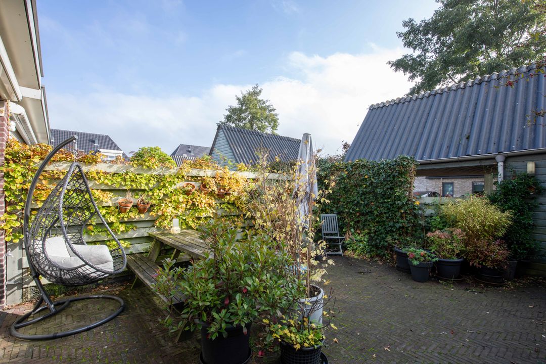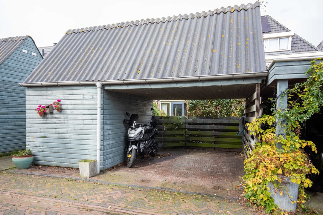 Via de openslaande deuren bereik je de zonnige achtertuin. Hier is altijd wel een plekje te vinden in de zon of in de schaduw. De tuin heeft een deur aan de zij- en aan de achterkant. Zo bereik je makkelijk je auto, die je op eigen terrein parkeert onder de carport. Rij je elektrisch? Dan is opladen geen probleem met je eigen laadpaal. De carport is voorzien van inbouwspots op een bewegingsmelder, wel zo fijn als je in de avond je auto parkeert. De houten berging is voorzien van elektra en heeft een vliering die doorloopt boven de carport. Veel opbergruimte!