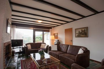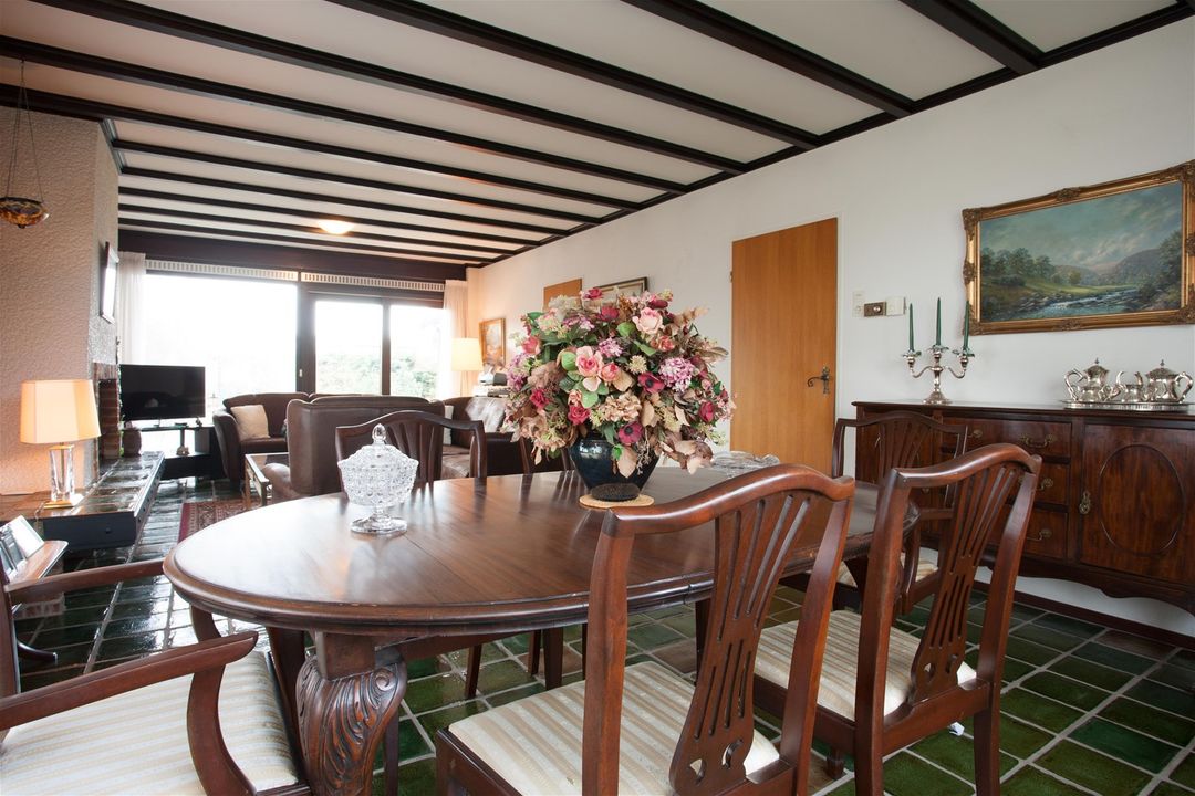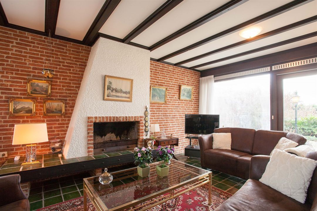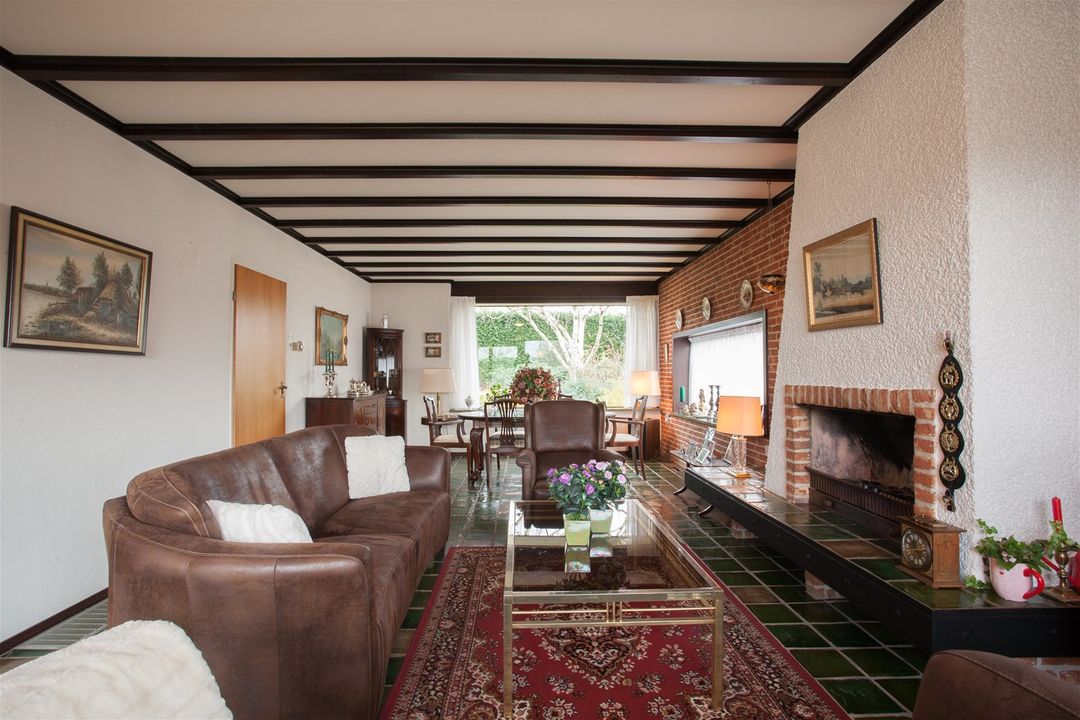 De woonkamer loopt van de voorzijde naar de achterzijde van de woning en is volledig privé door de hoge beplanting. U treft een grote houtgestookte openhaard. Via de schuifpui is de zonnige tuin met terras bereikbaar.