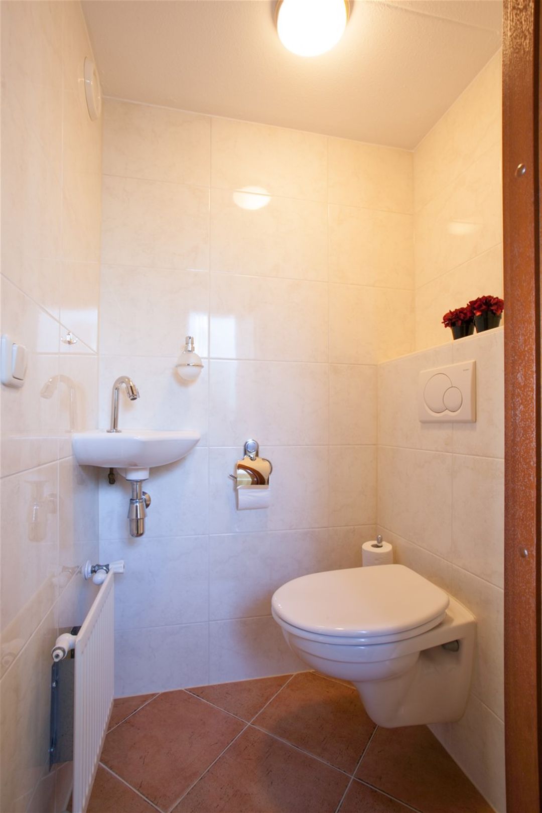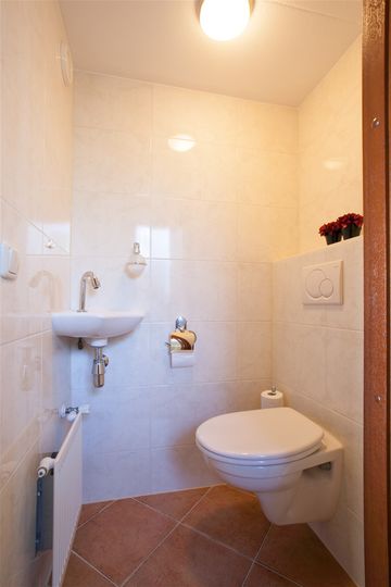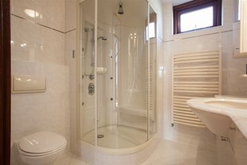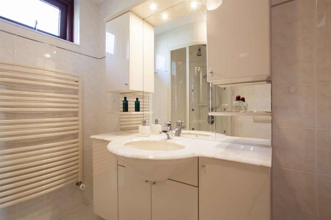 De badkamer: De badkamer is uitgerust met een wastafel met meubel, een stoom-douchecabine en een zwevend toilet. De ruimte is geheel betegeld en heeft een natuurlijke lichtinval.