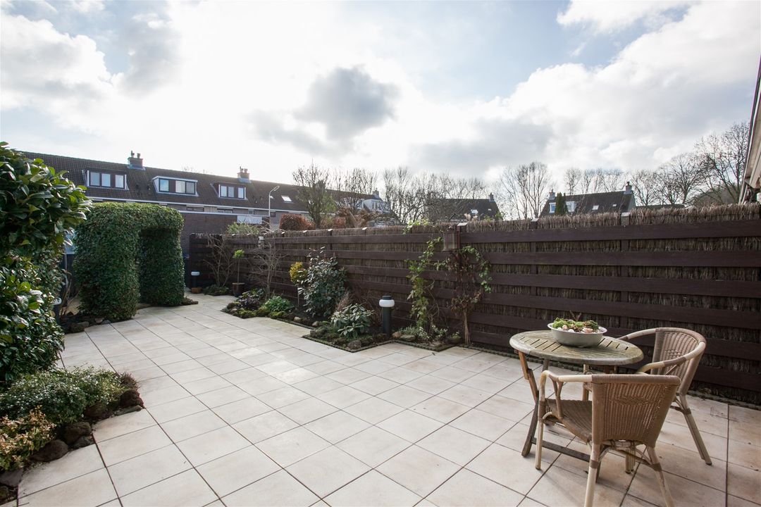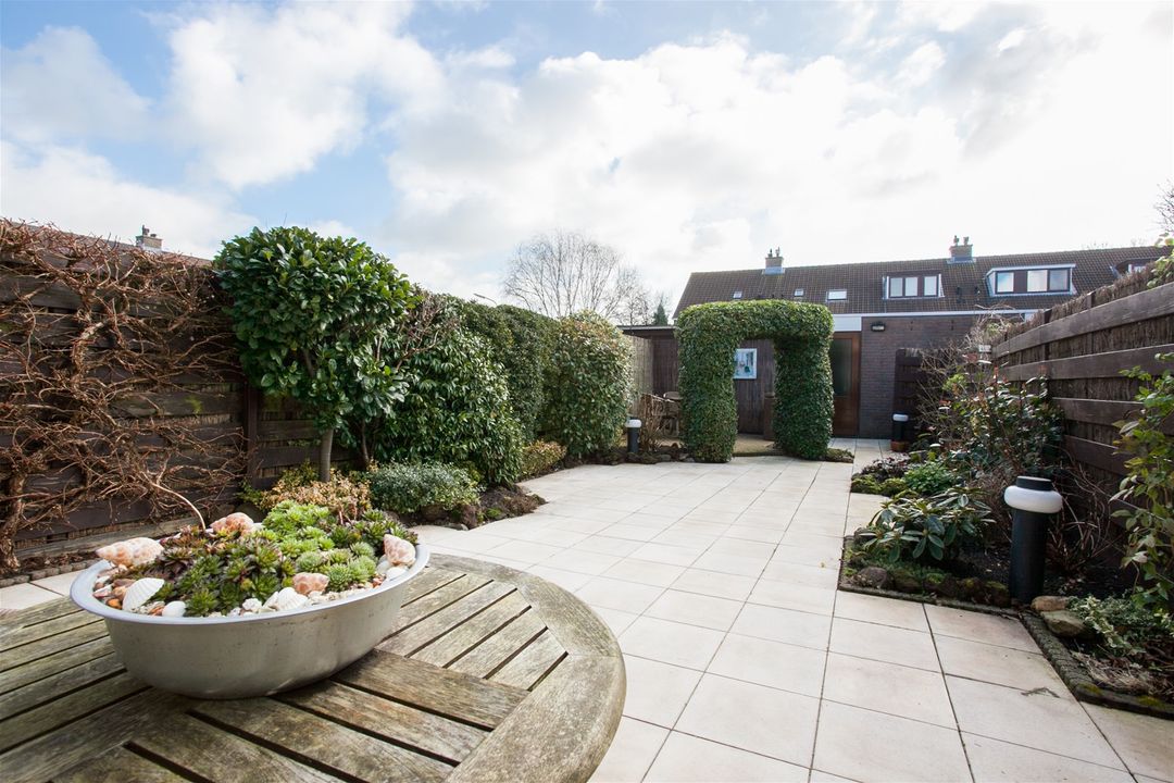 De tuin: Deze fraai aangelegde tuin op het zonnige zuidoosten is een plaatje! Hier kunt u verschillende zithoekjes creëren zowel in de zon als in de schaduw. De stenen berging biedt voldoende ruimte voor de fietsen en de tuinkussens.