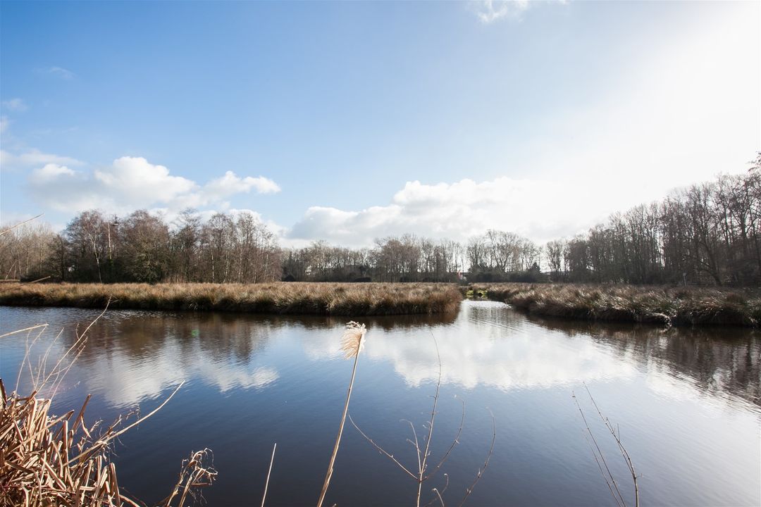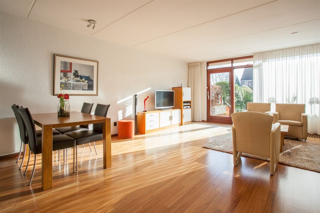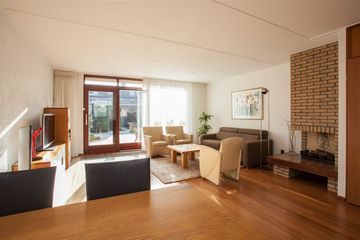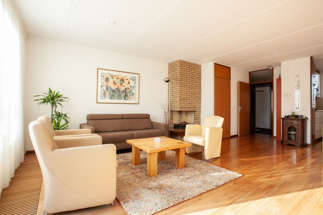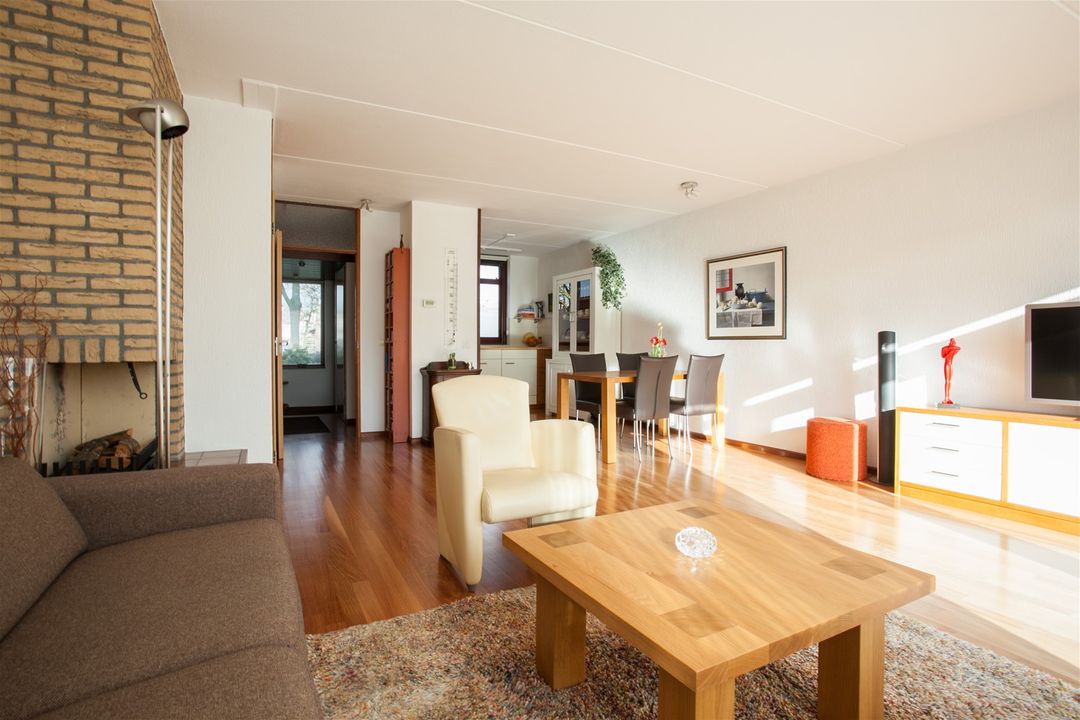 De living: Wat een heerlijk lichte ruimte is deze living met open haard. Dankzij de schuifpui maakt u een fijne verbinding met de tuin op een mooie zomerdag. De massief houten vloer geeft de kamer een warme sfeer.