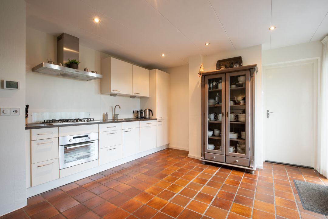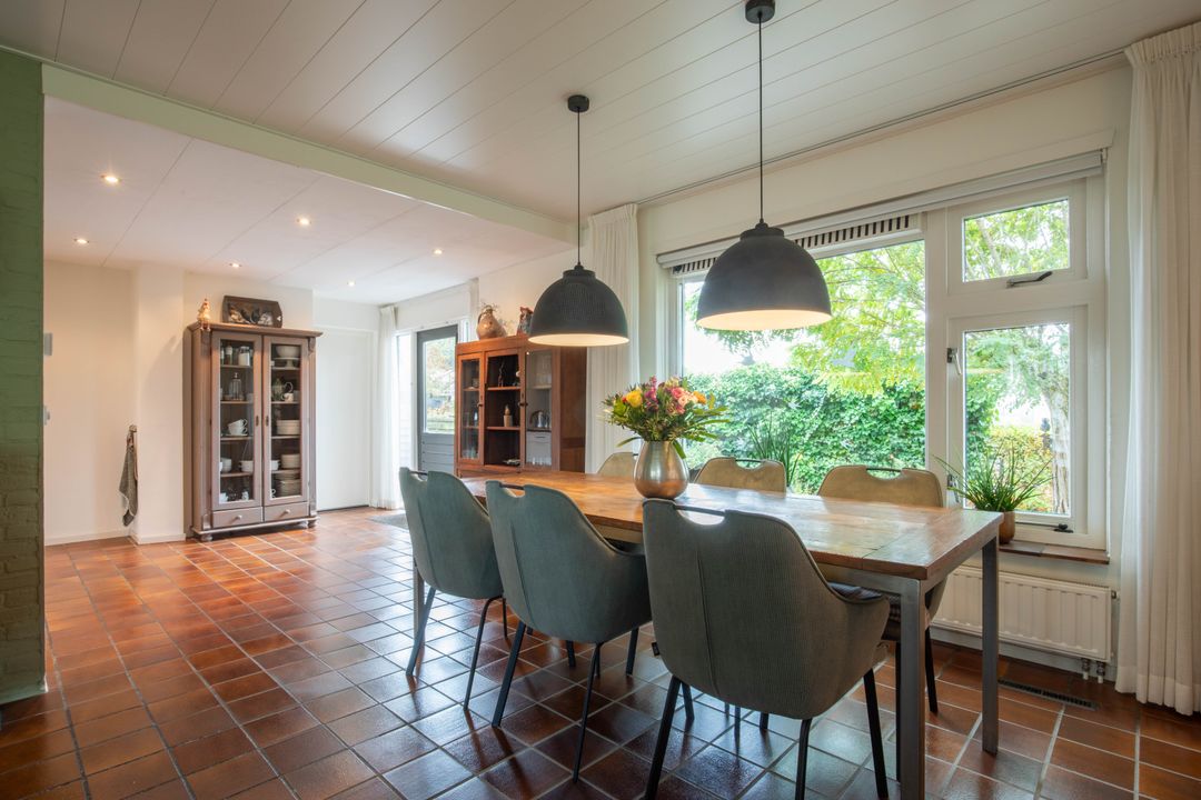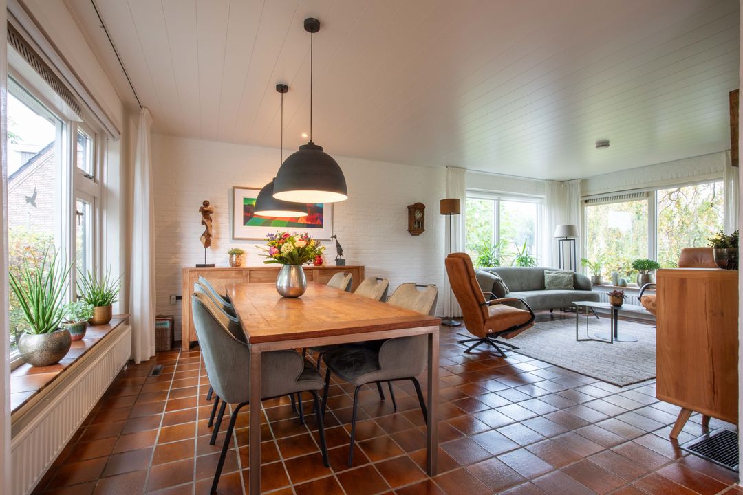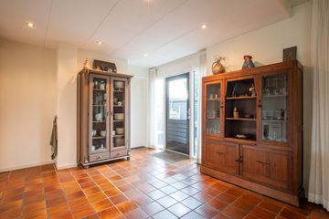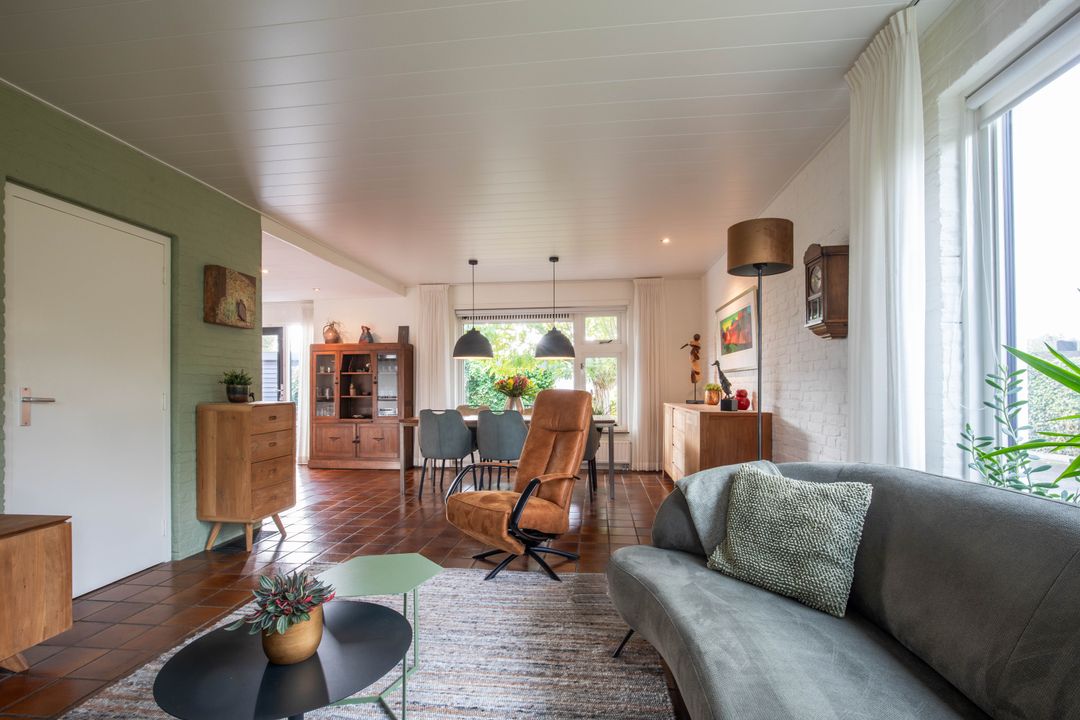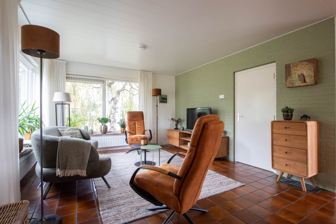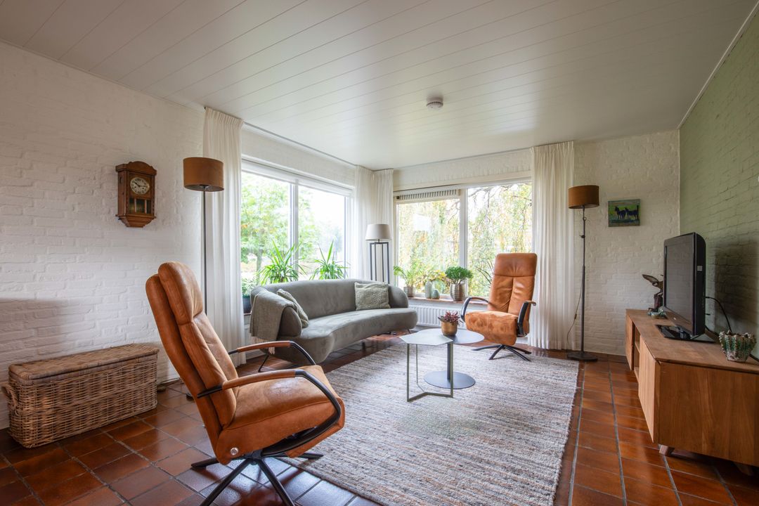 – Ruime, lichte woonkamer met grote raampartijen en terracotta vloer;