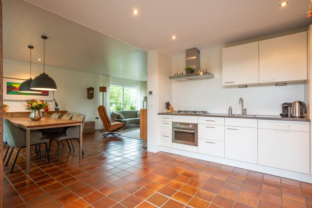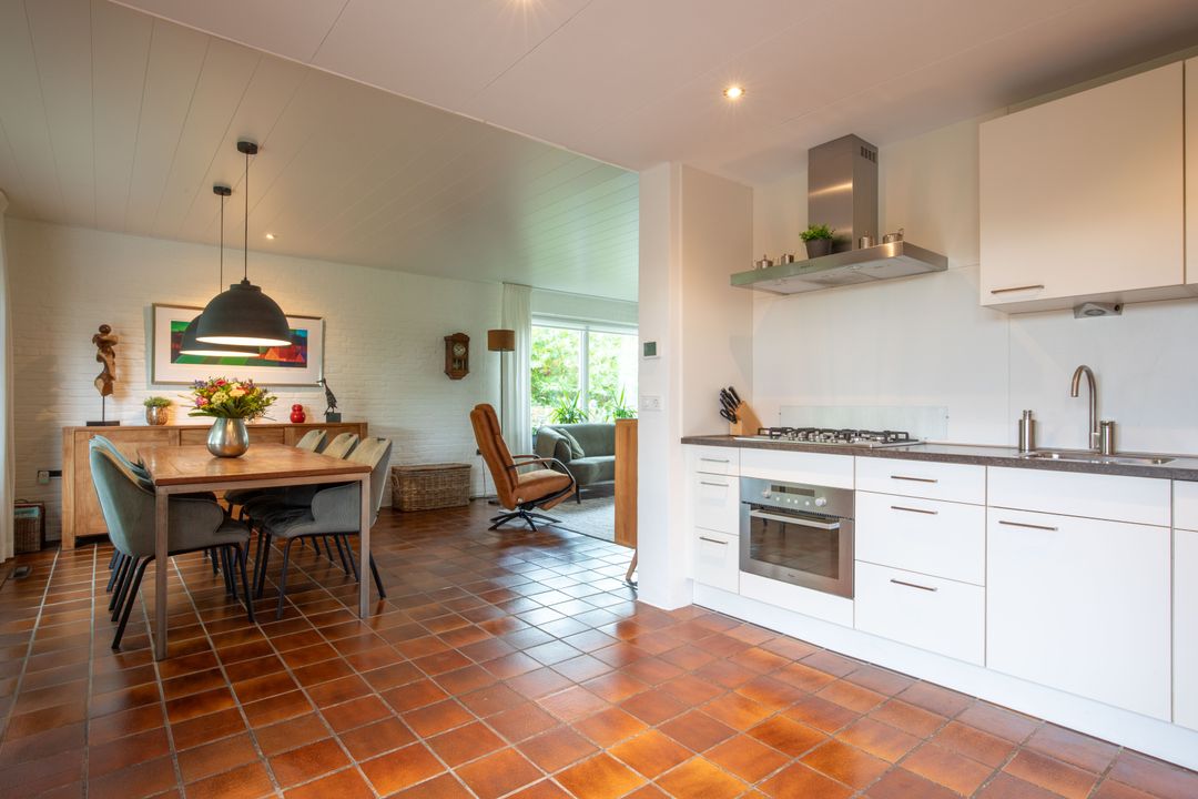 De rechterzijde van de woning is ingericht als één ruime en open woon-/leefruimte: de woonkamer met veel raampartijen zorgt voor een aangename natuurlijke lichtinval en grenst aan de moderne open keuken.