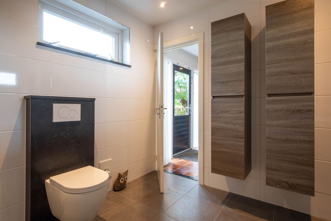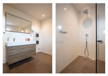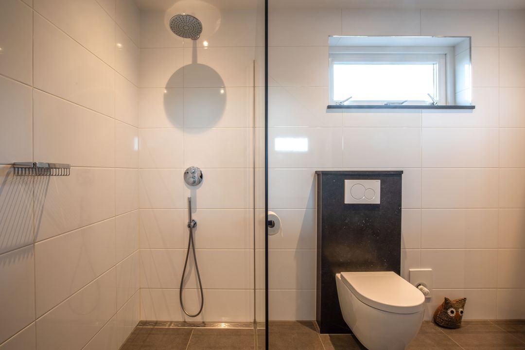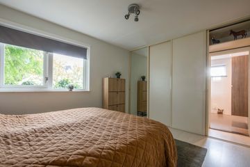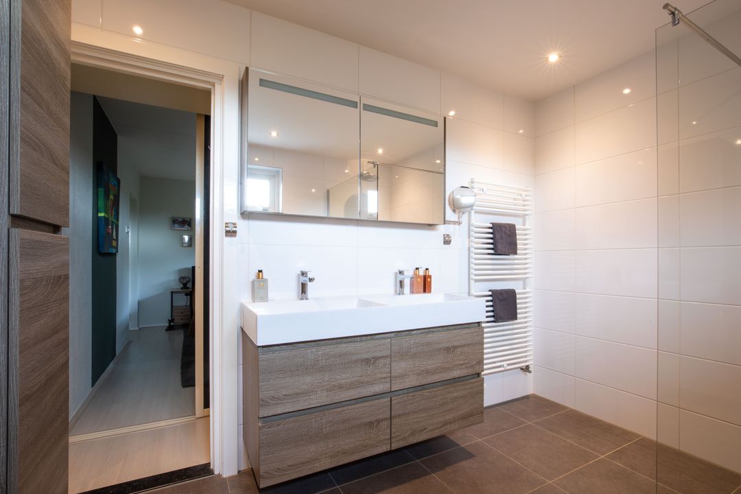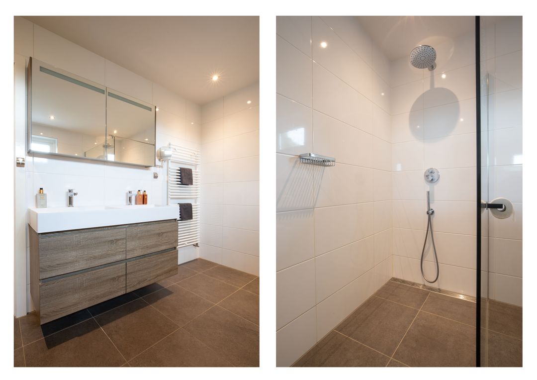 Op de begane grond bevindt zich tevens een ruime slaapkamer met vaste kastenwand en een ensuite badkamer die is gerenoveerd in 2019. De badkamer is uitgevoerd met een stortdouche, dubbele wastafel met meubel, spiegelkast, zwevend toilet en comfortabele vloerverwarming. Uitstekend geschikt voor gelijkvloers wonen.