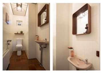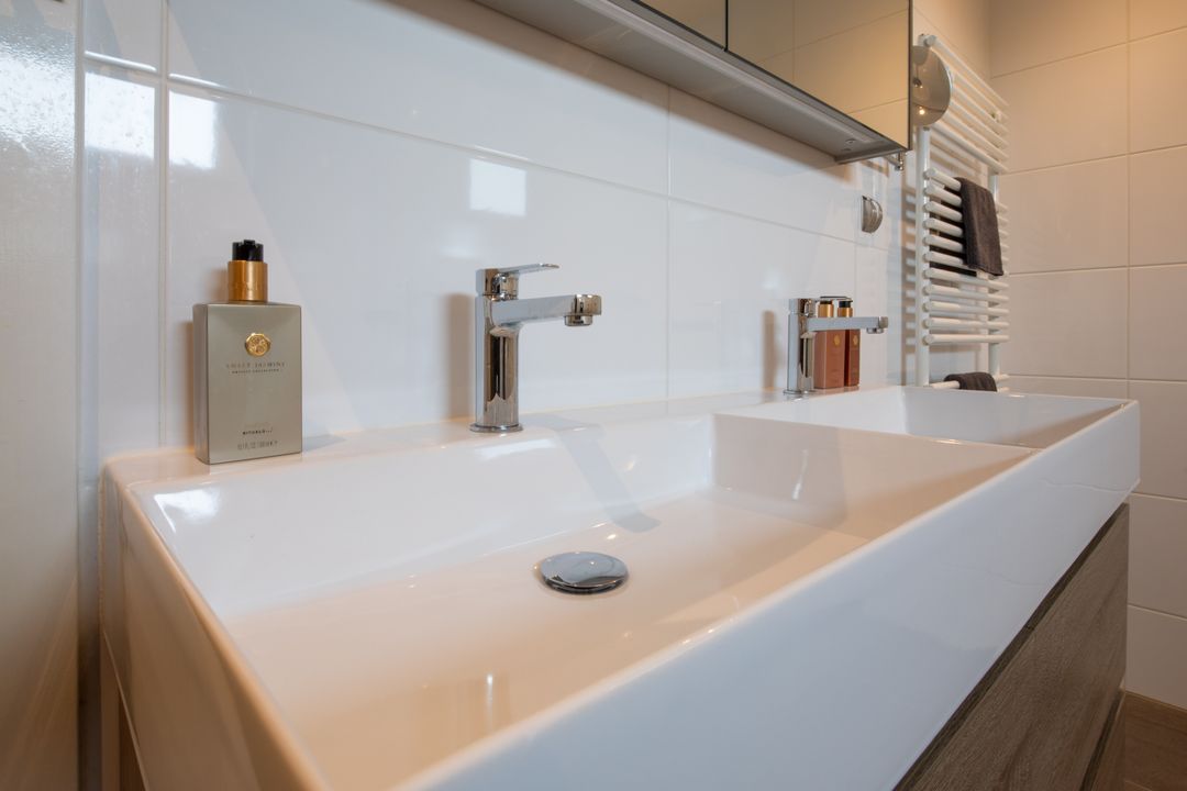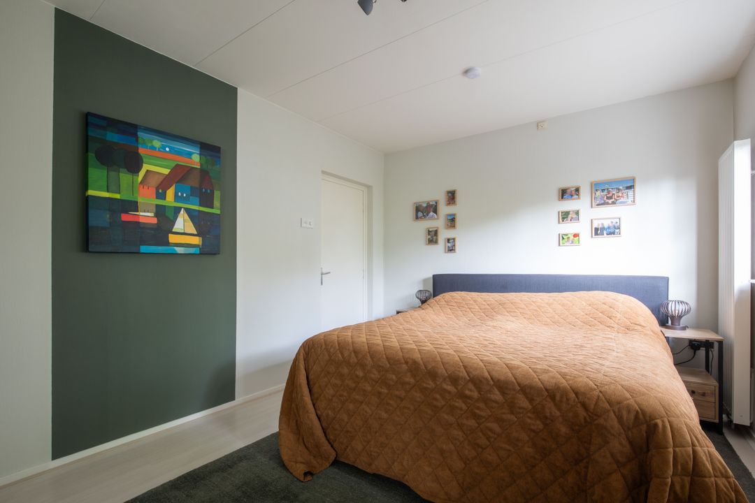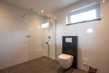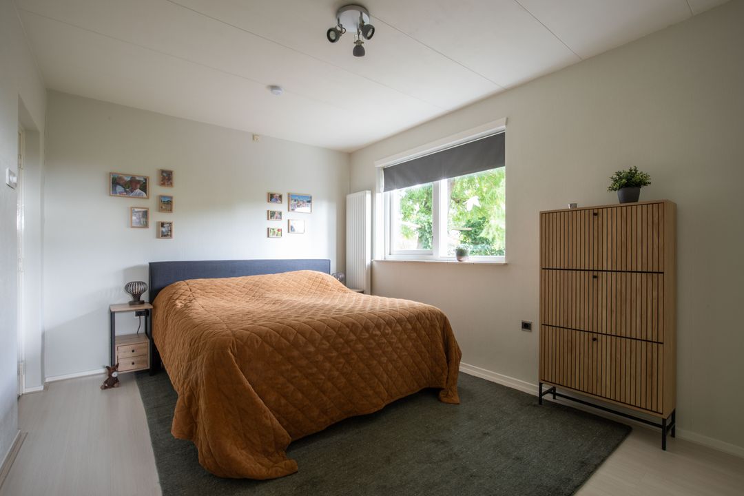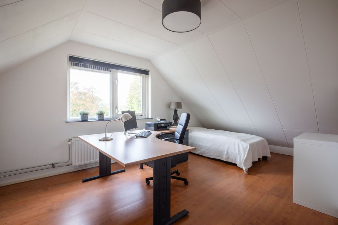 Op de begane grond bevindt zich tevens een ruime slaapkamer met vaste kastenwand en een ensuite badkamer die is gerenoveerd in 2019. De badkamer is uitgevoerd met een stortdouche, dubbele wastafel met meubel, spiegelkast, zwevend toilet en comfortabele vloerverwarming. Uitstekend geschikt voor gelijkvloers wonen.