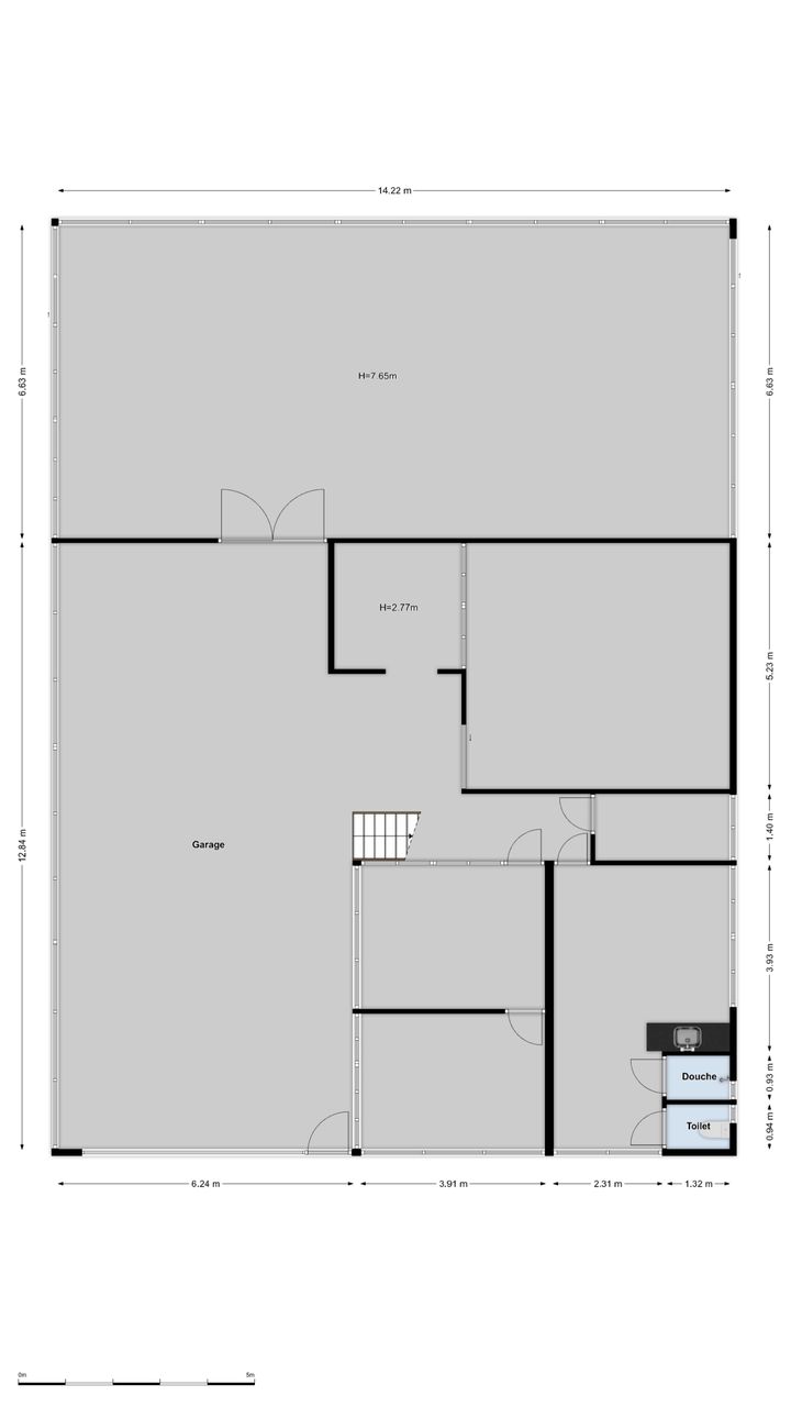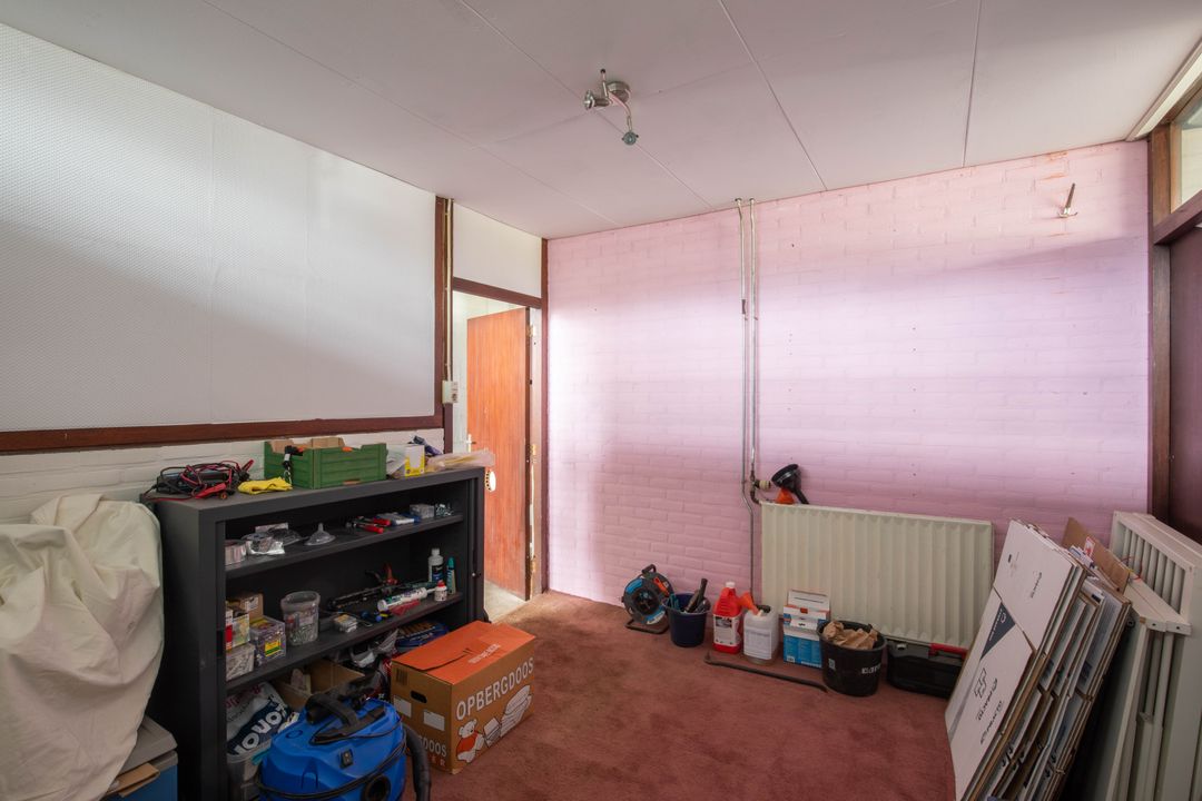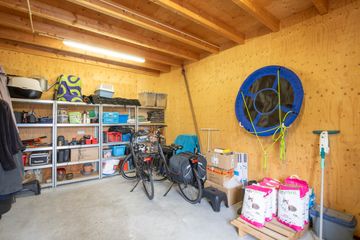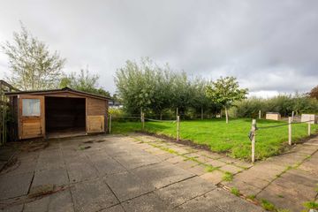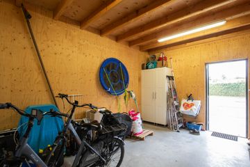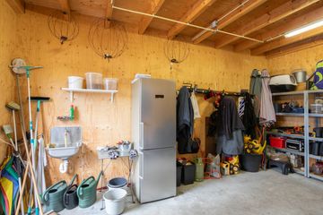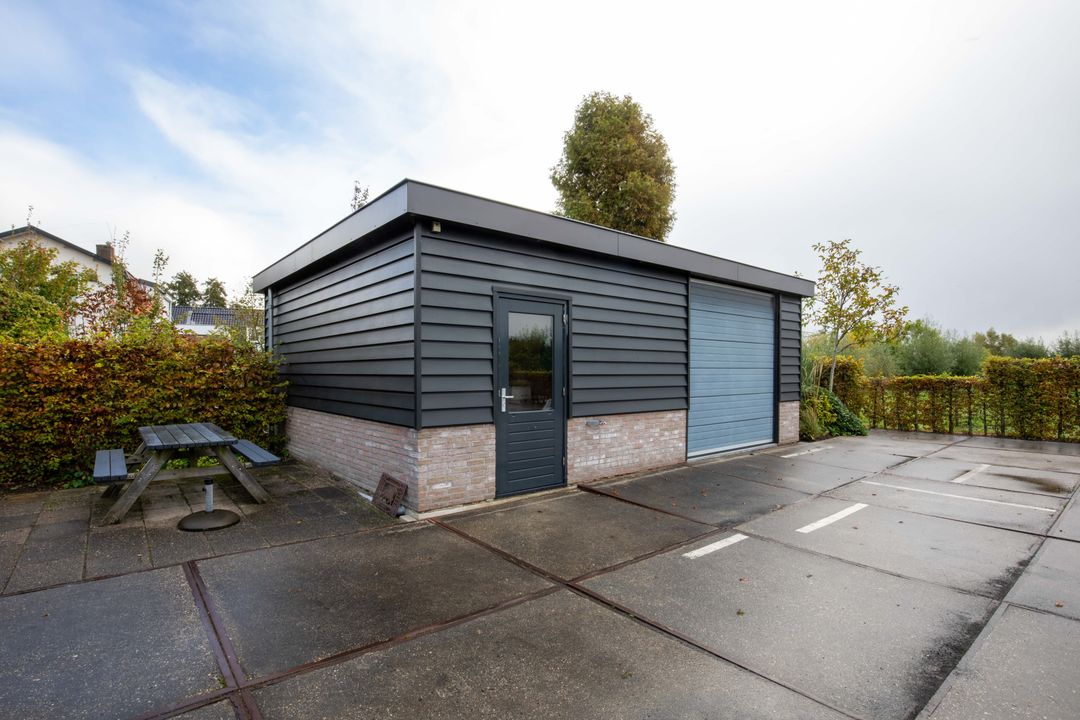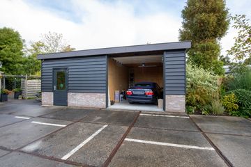 Achter de woning ligt een verhard terrein met stelconplaten, waar een vrijstaande stenen garage inclusief een berging is gesitueerd. De garage is voorzien van een elektrische deur. Er is voldoende ruime voor opslag en het parkeren van de auto.