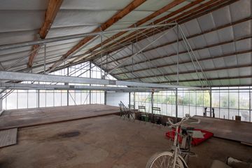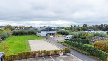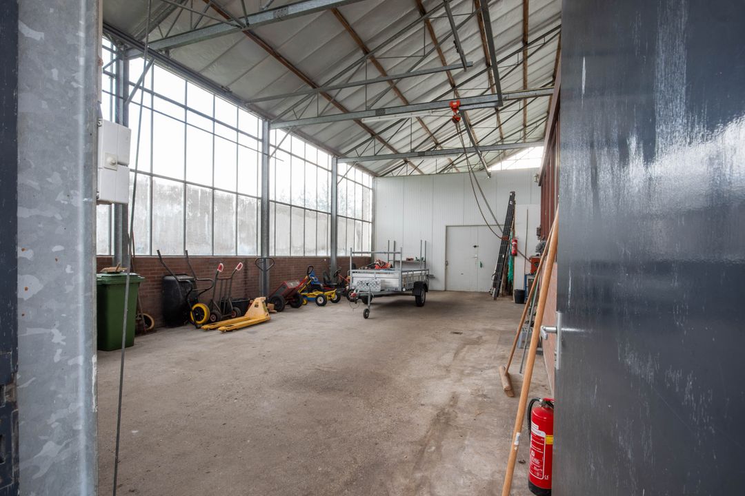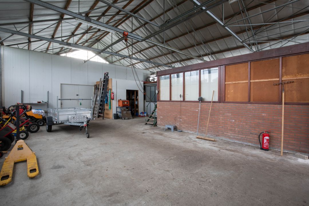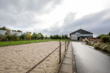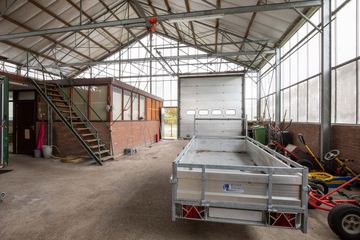 Verderop op het perceel ligt een (zand) buitenbak voor pony’s of alpaca’s, omgeven door grasvelden en afscheiding. En tevens bevindt zich hier een grote vrijstaande loods met overheaddeur. Deze loods is geschikt voor opslag of bedrijfsvoering; bovendien is een deel ingericht met kantoorruimte, douche en toilet. Achter in de loods zijn stallen/hekken aanwezig.