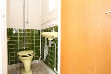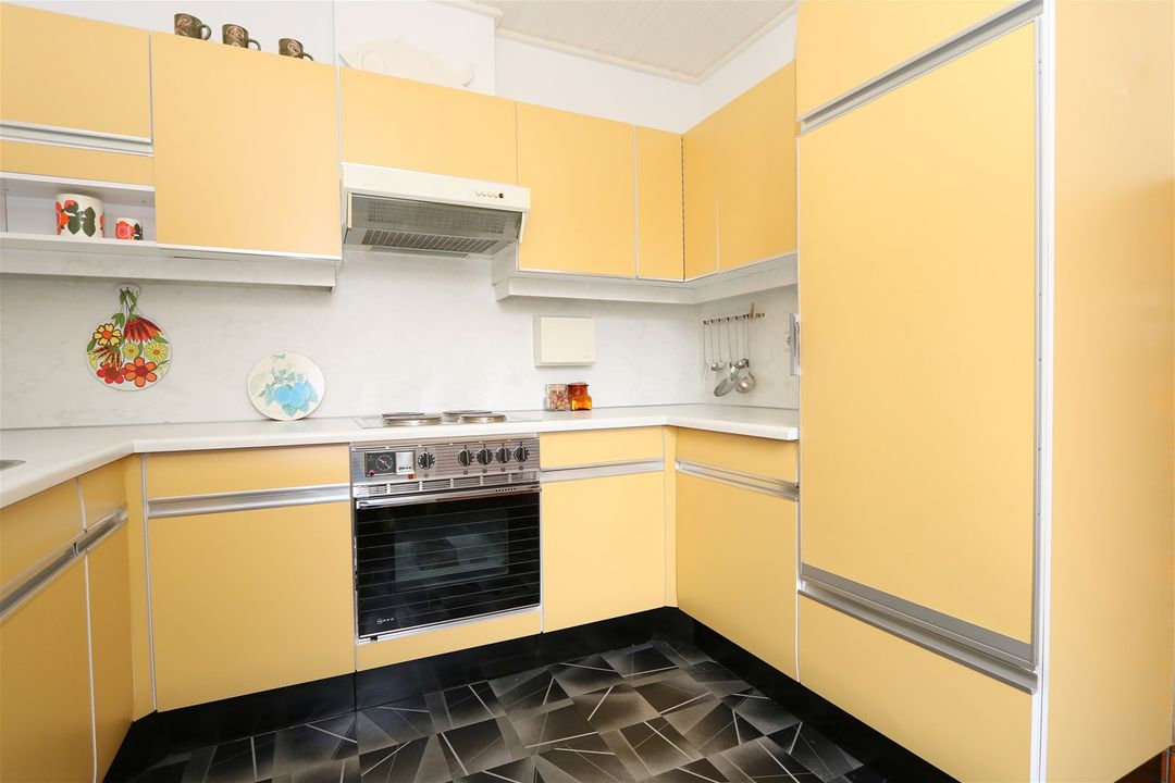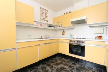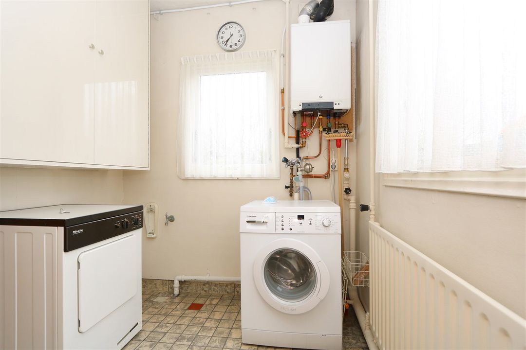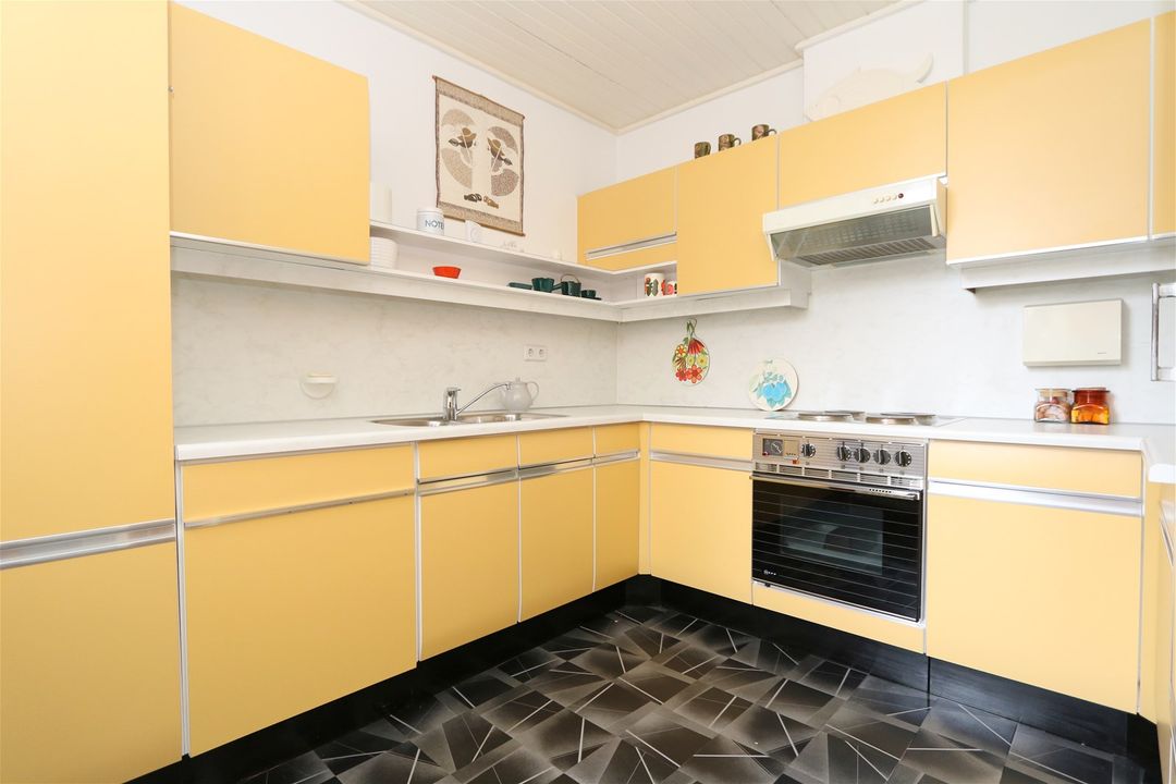De keuken bevindt zich aan de achterzijde en tevens is hier de toegang tot de aangebouwde bijkeuken. Hier bevinden zich het toilet met fonteintje, de CV ketel (Intergas HR combi – 2014) en de aansluitingen voor de wasmachine en droger.