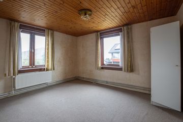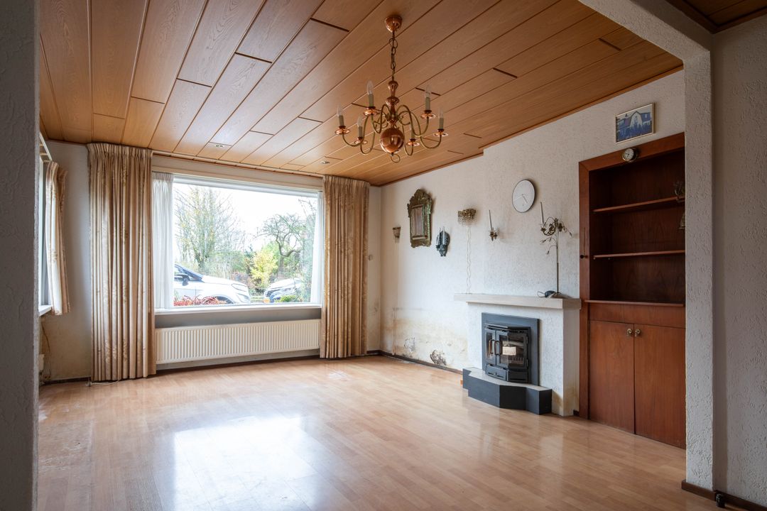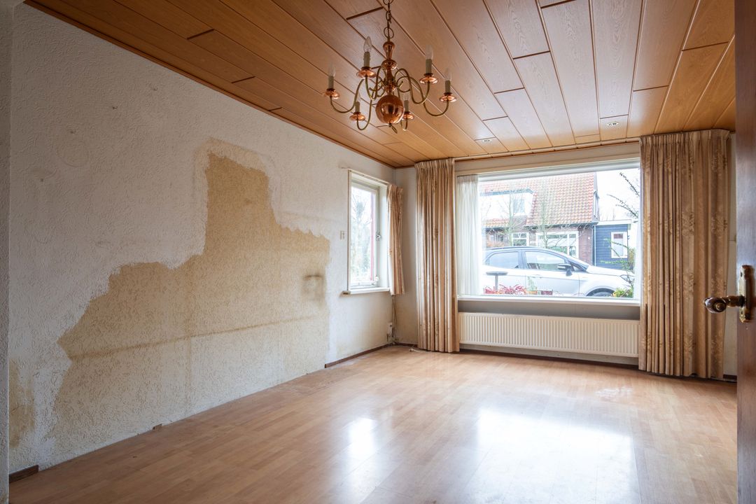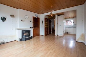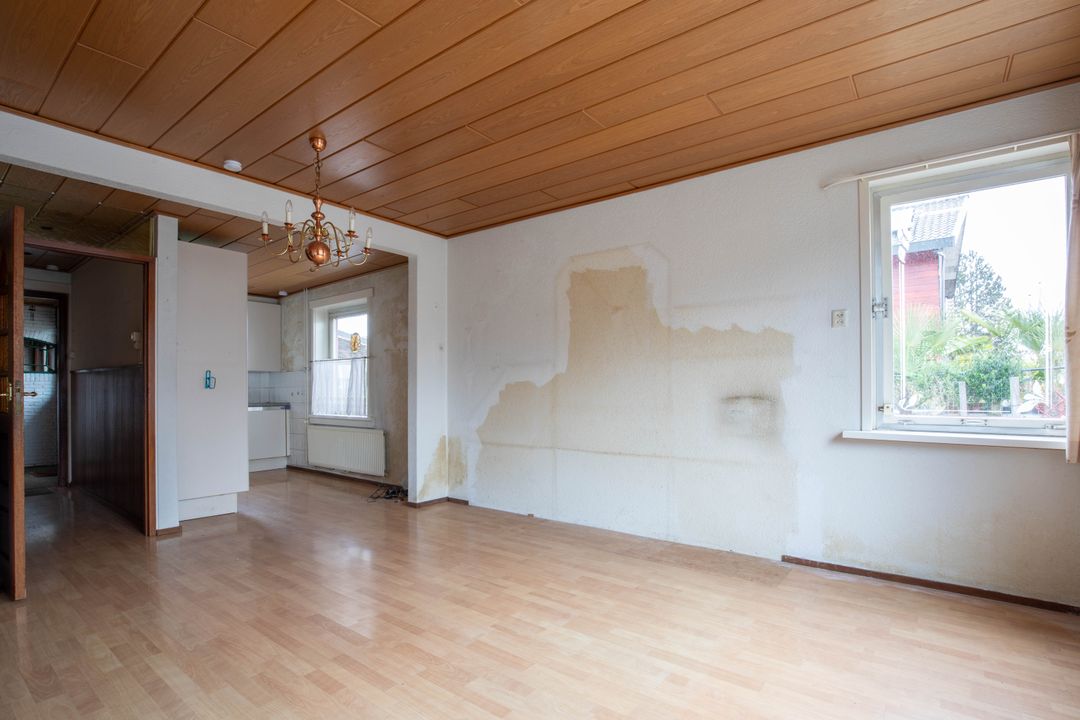 Vanuit de hal komt u in de woonkamer, die aan de voorzijde van de woning is gelegen. De woonkamer staat in open verbinding met de keuken en beschikt over een houthaard. Door de zijramen geniet de woning van een prettige natuurlijke lichtinval. De vloer in de woonkamer toont verzakking en houtrot, waardoor het noodzakelijk is hier een nieuwe vloer te realiseren.