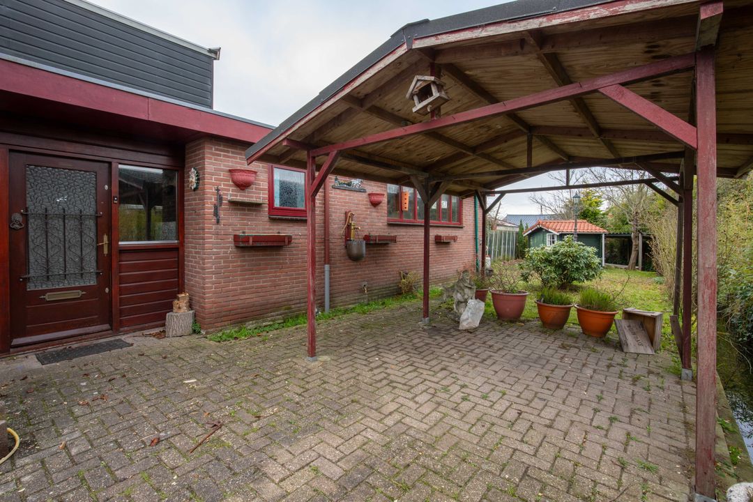 De woning beschikt over een voor-, zij- en achtertuin. De achtertuin is gesitueerd op het noordwesten en grenst direct aan het vaarwater. De tuin beschikt over een eigen oprit met carport en een vrijstaand houten schuurtje. De ligging aan vaarwater met een eigen ligplaats maakt dit object extra aantrekkelijk voor liefhebbers van varen en het buitenleven.