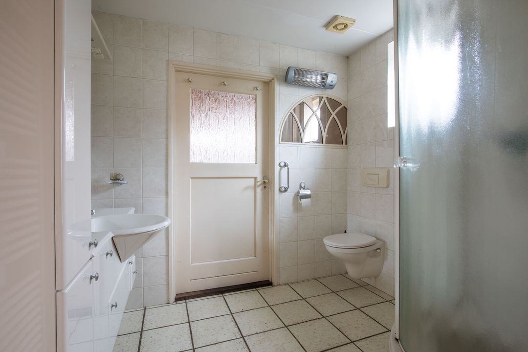 In het aangebouwde gedeelte aan de achterzijde bevindt zich de badkamer, welke is uitgerust met een douche, een wastafel met meubel en een toilet.