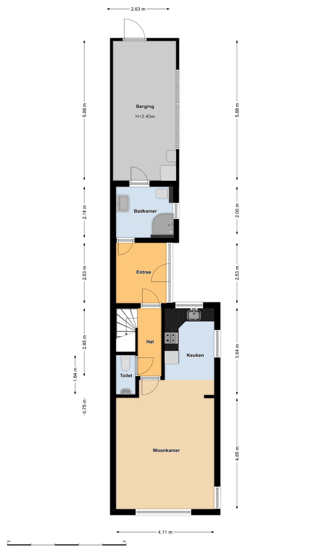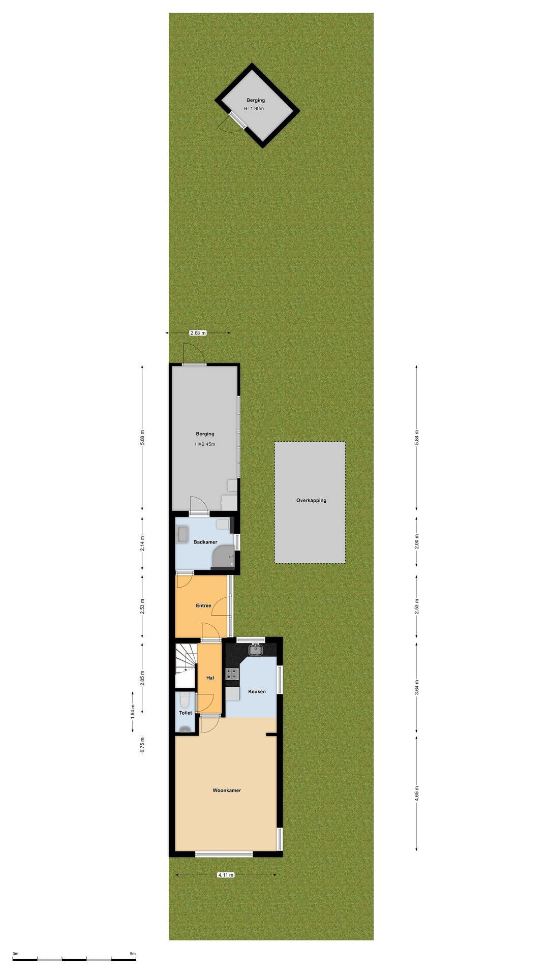 – Beneden verdieping met badkamer en aangebouwde bijkeuken;